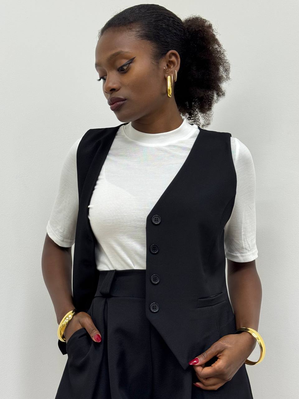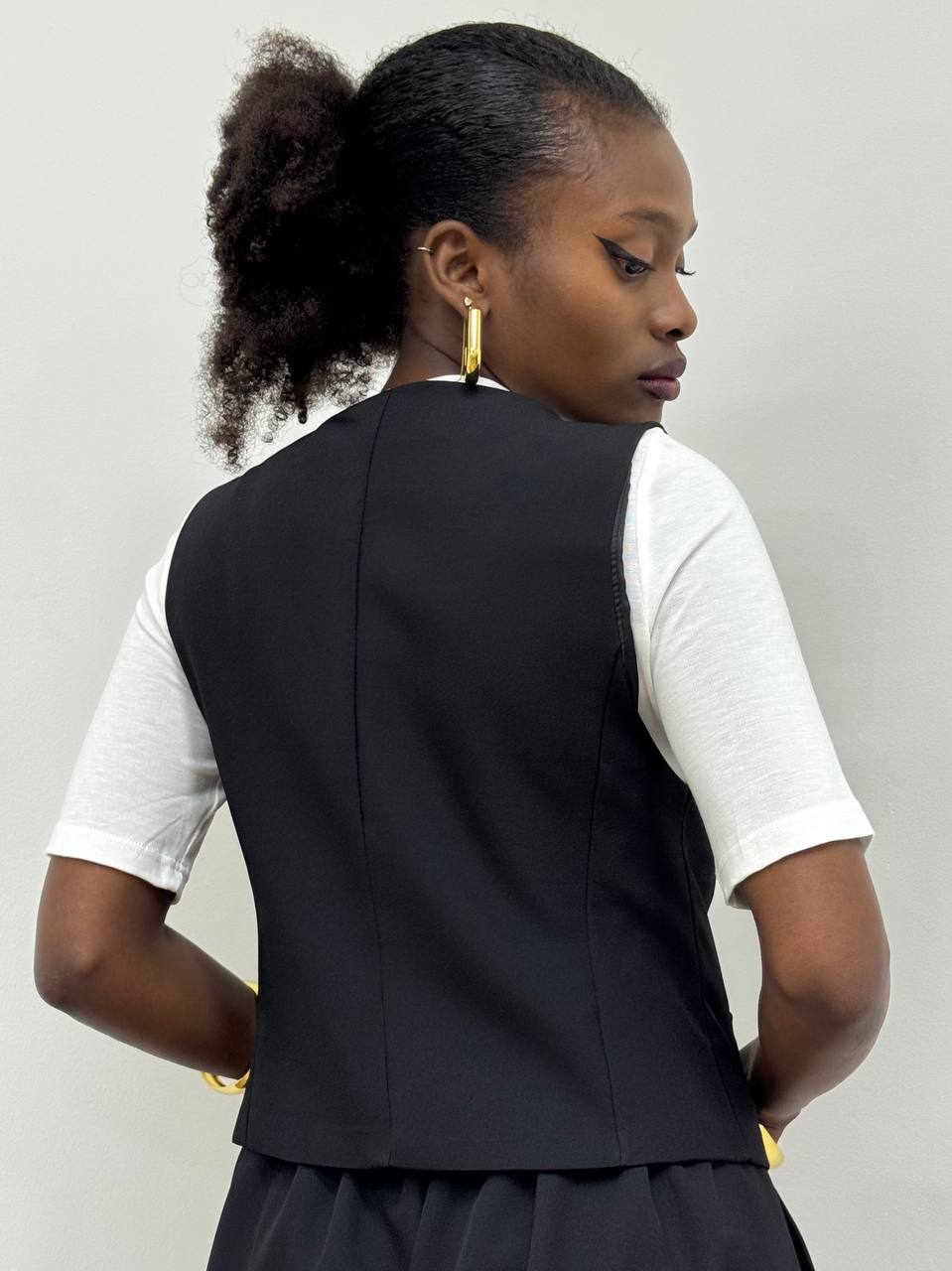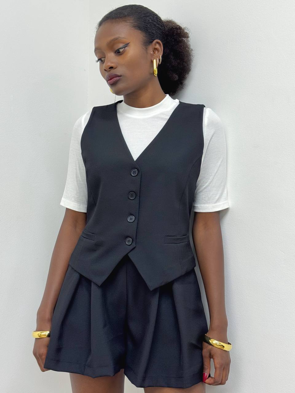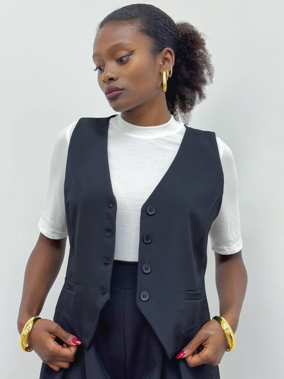 Gilet smanicato sartoriale con chiusura di bottoni frontali a tinta unita.
