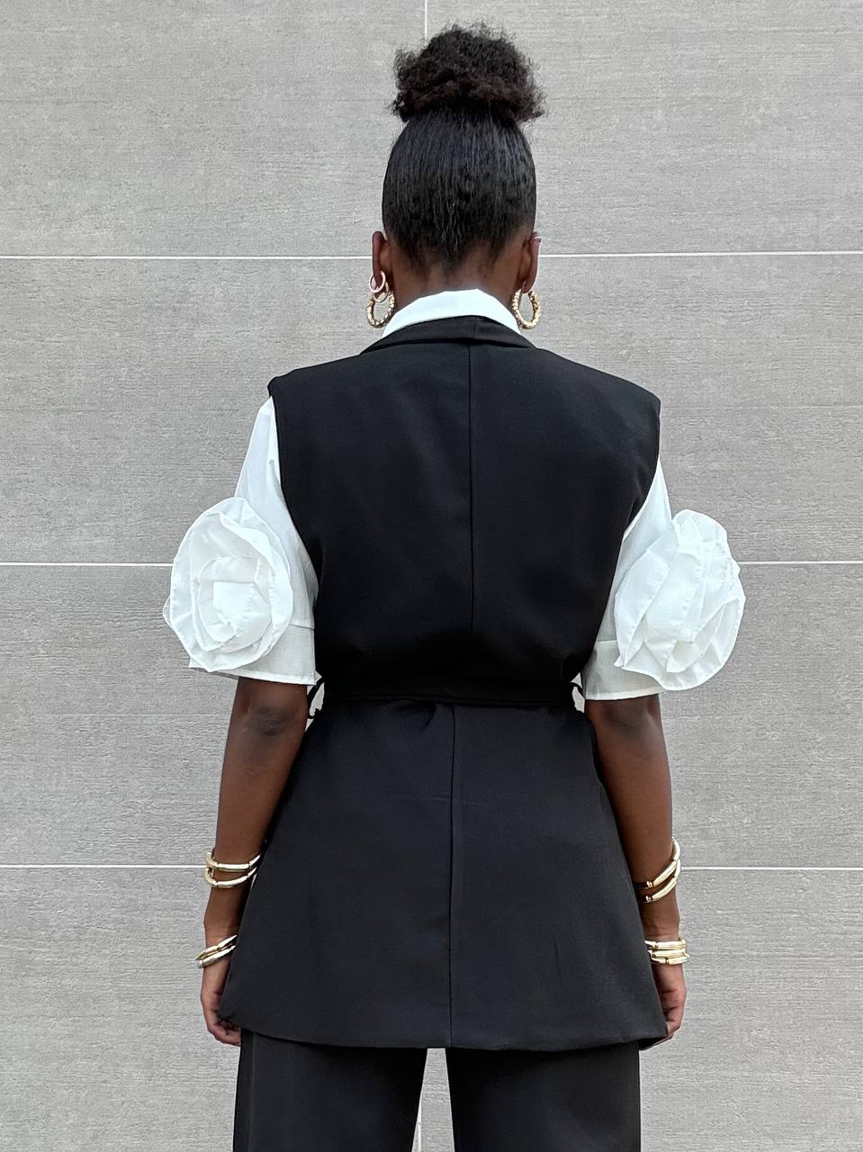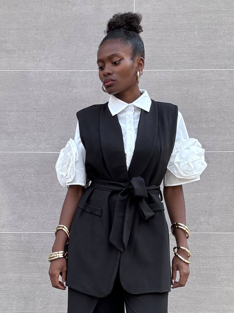 Gilet lungo con dettaglio di cinturino in vita incorporato sul punto vita con dettaglio di finte taschine laterali.
