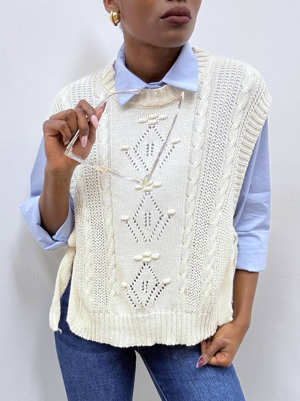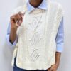 Gilet smanicato in misto cotone realizzato in raffinato macramè, dal design delicato e ricercato. La lavorazione traforata crea un elegante gioco di trasparenze che valorizza la silhouette con leggerezza e femminilità.