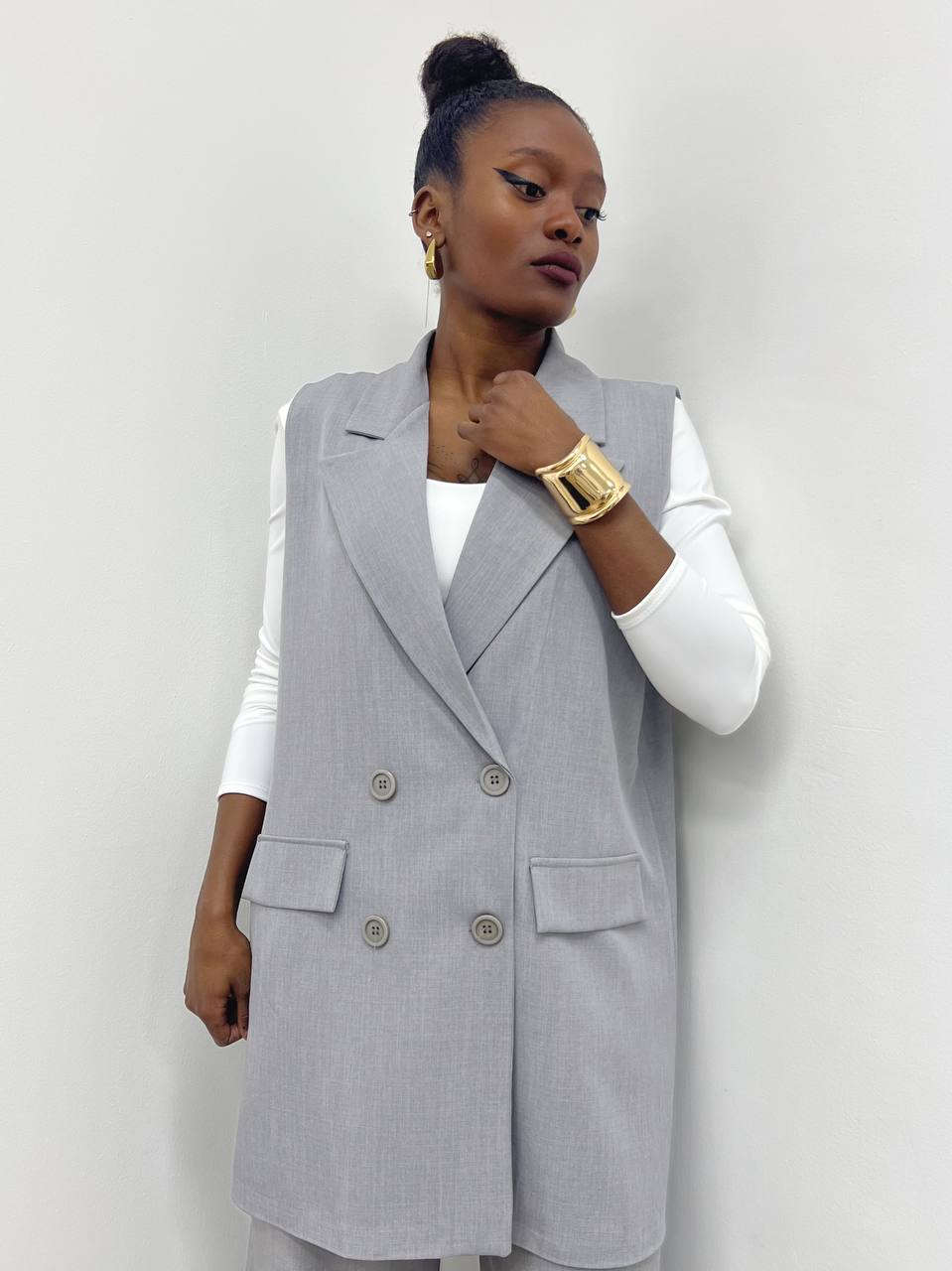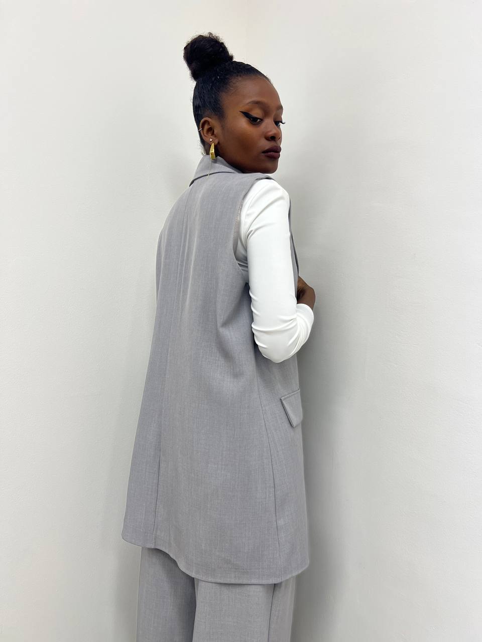 Gilet lungo con scollo a V con dettaglio di 4 bottoni di chiusura con dettaglio di finte taschine.