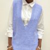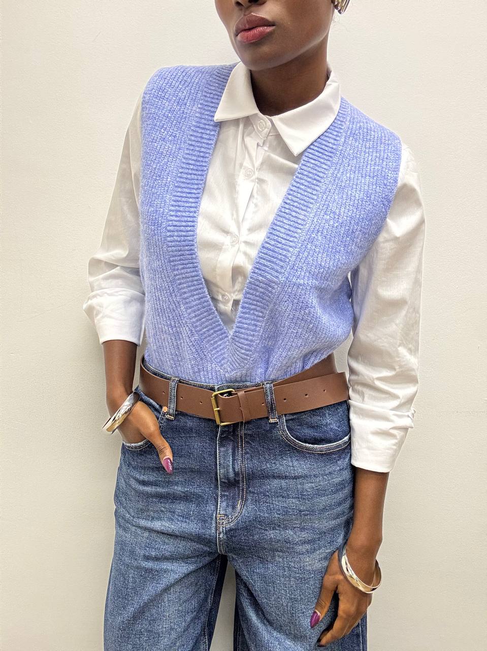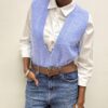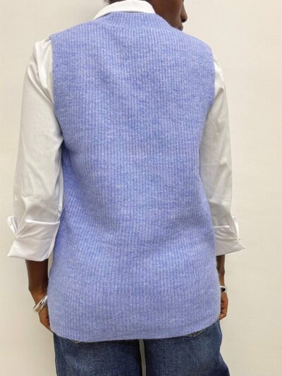 Gilet smanicato con elegante scollo a V, realizzato in maglia a costine elasticizzata che abbraccia delicatamente la figura senza costringere. Il tessuto confortevole e flessibile garantisce una perfetta vestibilità, mentre la lavorazione a costine aggiunge un tocco moderno e dinamico. Un capo versatile, ideale da indossare da solo o abbinato a camicie e top per completare look casual o più ricercati.