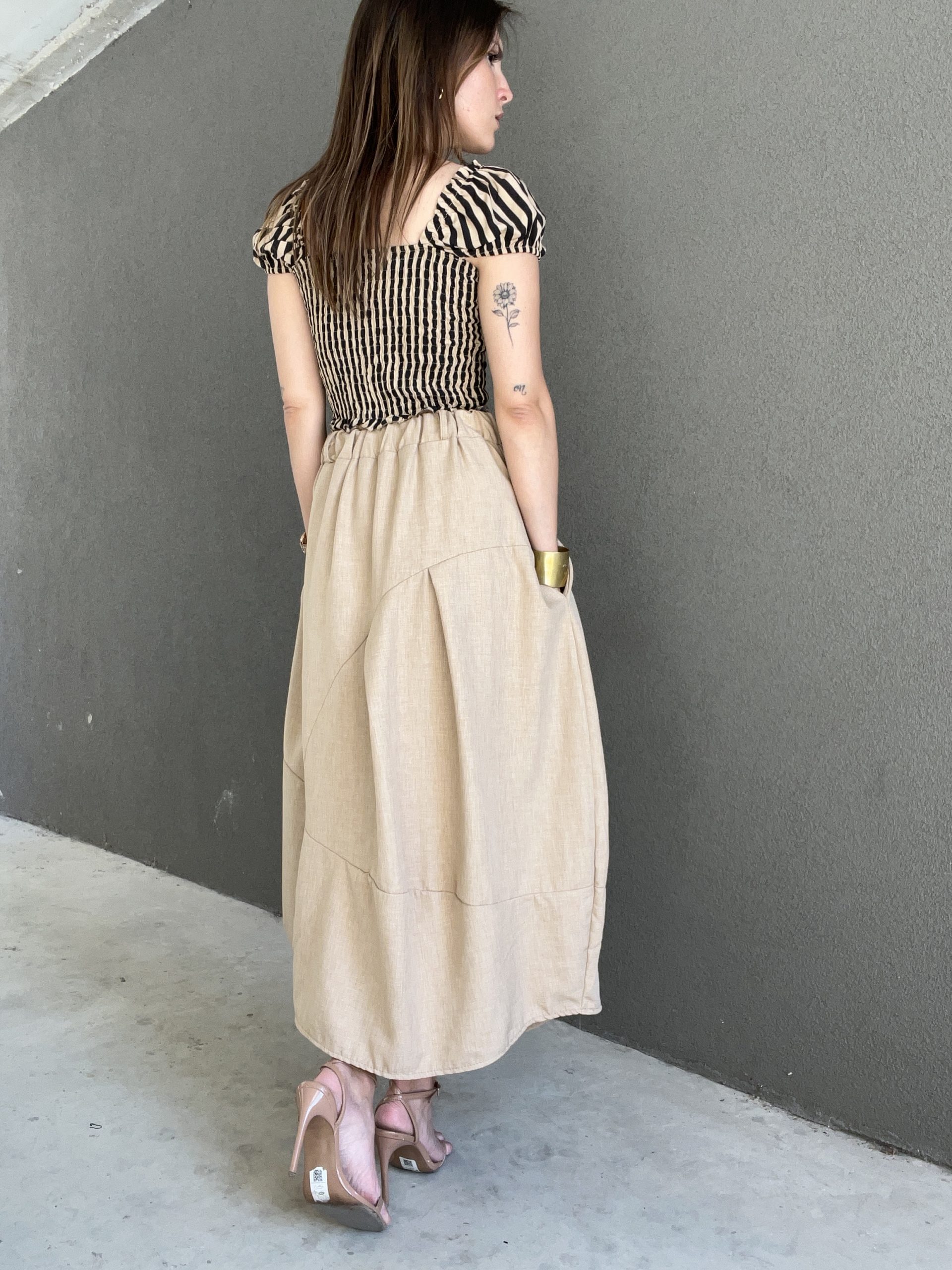Gonna a vita alta elasticizzata con tasche laterali. Veste da taglia 38 a taglia 48.