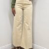 Jeans a vita alta e gamba larga in tessuto denim a tinta unita, dal taglio ampio e fluido che dona eleganza e movimento alla silhouette. La chiusura frontale con bottone e zip garantisce praticità e una calzata precisa, mentre la taschina laterale aggiunge un dettaglio funzionale e contemporaneo.