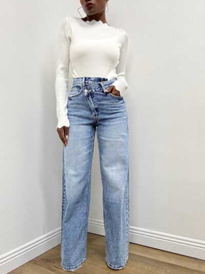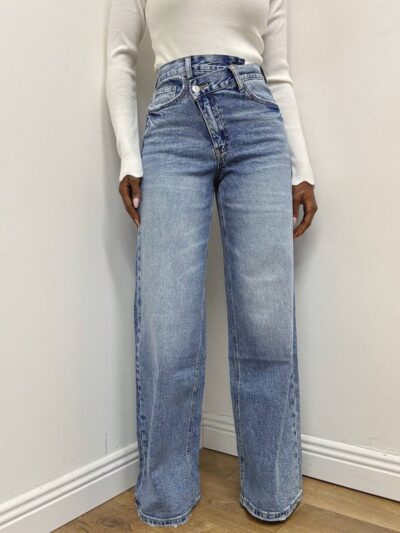 Linee morbide e stile contemporaneo si fondono in questo jeans modello palazzo a vita media, pensato per valorizzare la figura con un fit fluido e confortevole. La chiusura è asimmetrica è affidata ad un bottone in metallo e una zip frontale, mentre i passanti in vita permettono di completare il look con cinture per un tocco personale.