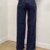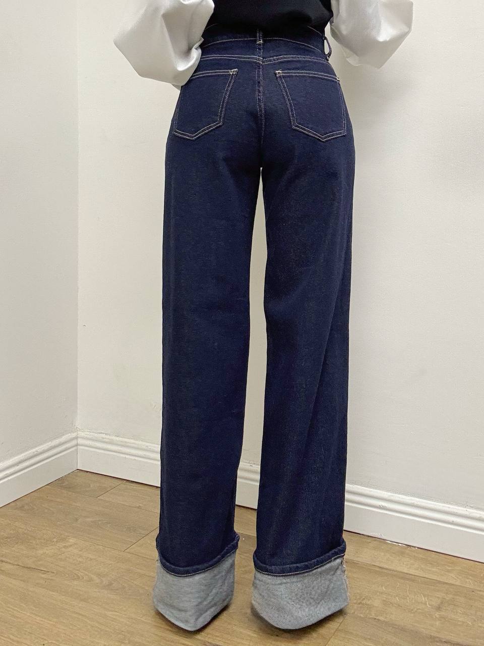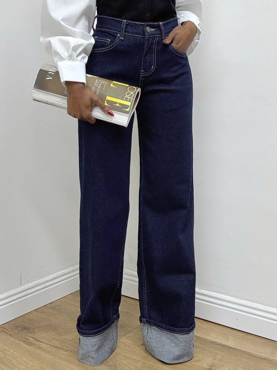 Jeans a palazzo in tessuto denim a tinta unita, dal taglio ampio e fluido che valorizza la silhouette conferendo un look elegante e contemporaneo. La vita regolare con chiusura frontale a bottoni e zip garantisce una calzata perfetta, mentre il risvolto sul fondo aggiunge un dettaglio moderno e curato.