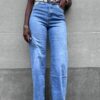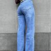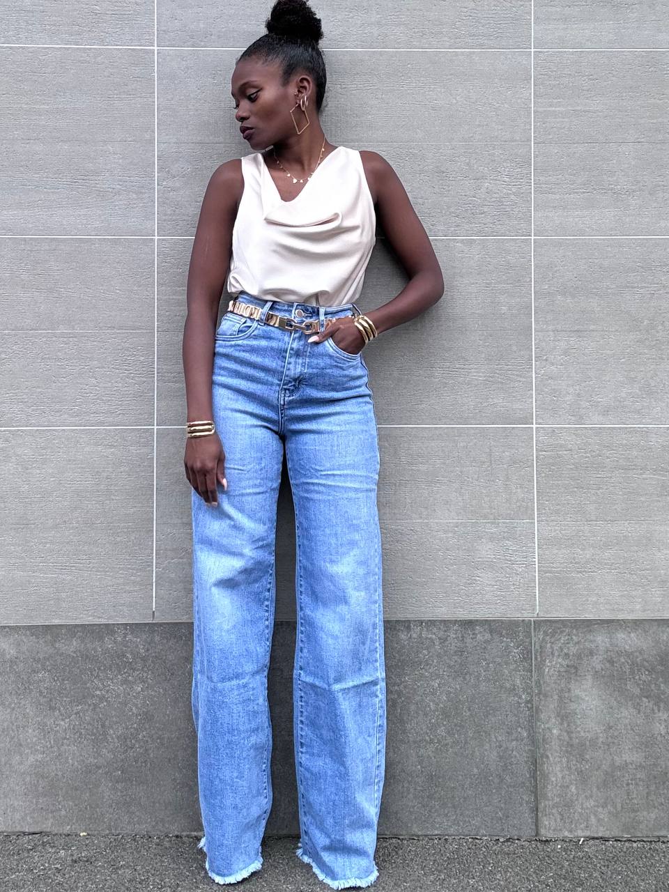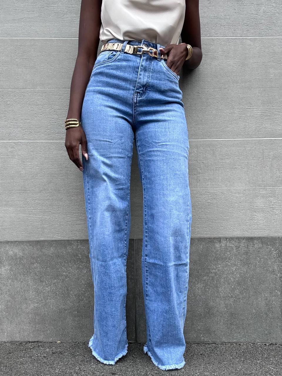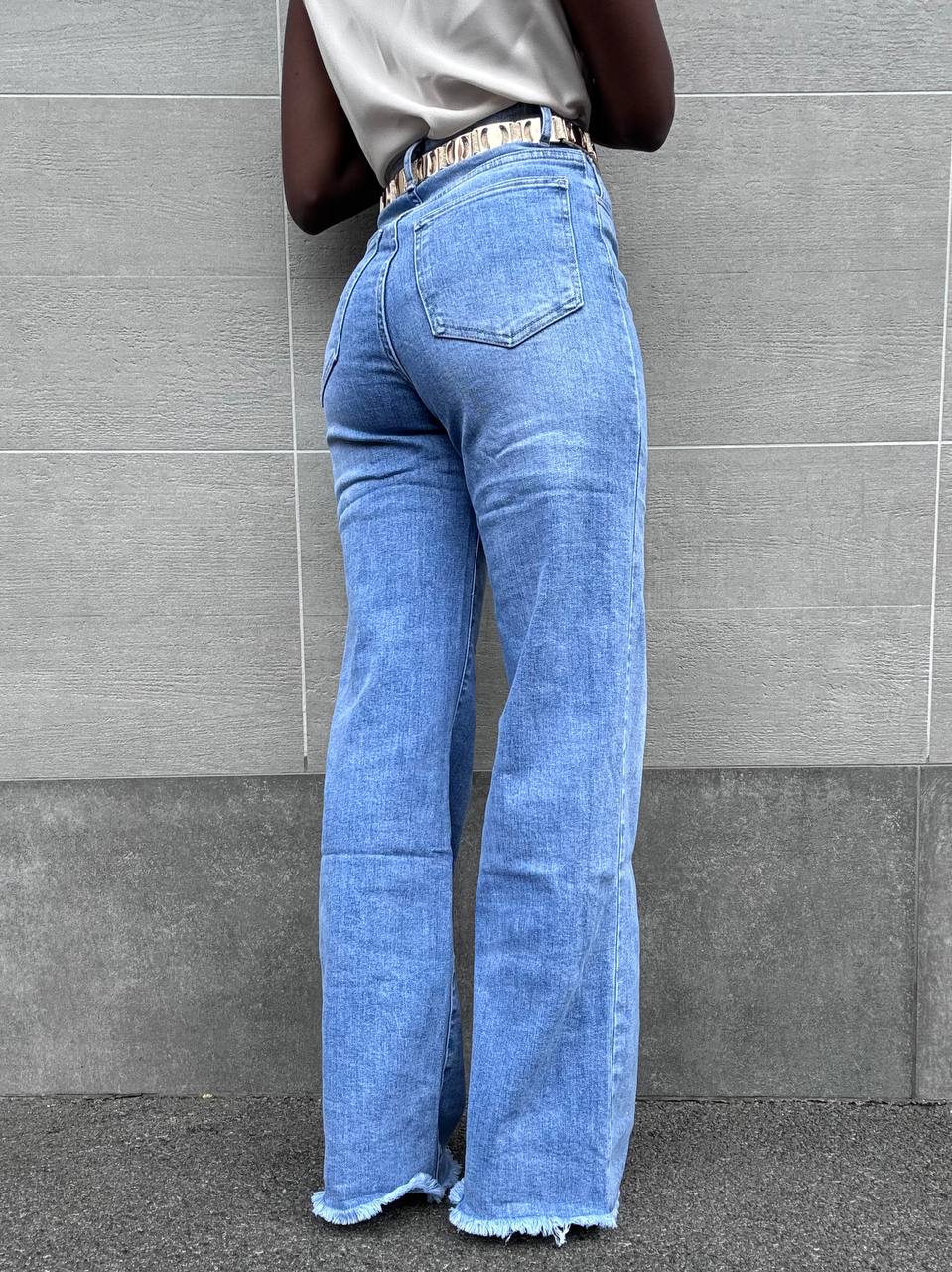 Jeans chiaro a palazzo con dettaglio di taschine centrali laterali. Taschine posteriori. Chiusura con bottoni e zip.