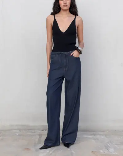 Jeans dallo stile jogger, perfetto mix tra comfort e tendenza. Realizzato in denim morbido e leggermente strutturato, presenta una vita elasticizzata con coulisse regolabile, per una vestibilità comoda e personalizzabile. Sulla fascia in vita sono presenti anche asole per cintura, che permettono di aggiungere un tocco più definito al look.