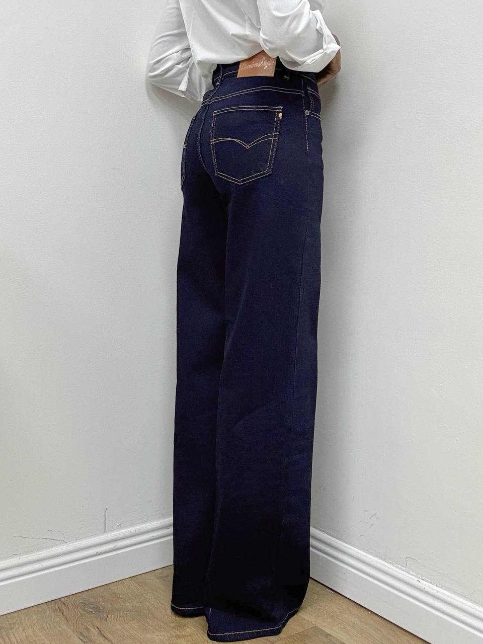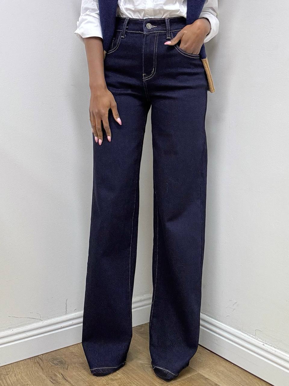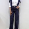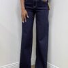 Jeans a palazzo con lavaggio scuro, realizzati in denim morbido e strutturato. Il modello presenta linee ampie e fluide che slanciano la figura, mentre i bordini rifiniti donano un tocco di eleganza e cura nei dettagli.