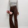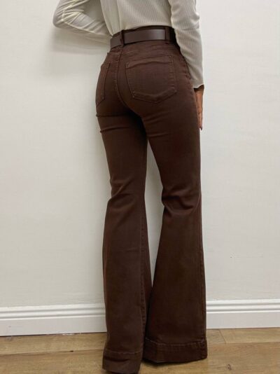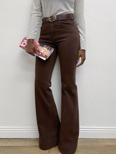 Riscopri il potere del denim sartoriale con questi jeans flare a vita alta, un omaggio sofisticato agli anni ’70, reinterpretati in chiave contemporanea. Realizzati in un denim color cioccolato a trama compatta, questi jeans donano una silhouette slanciata e femminile, grazie alla vita alta che definisce il punto vita e alla gamba che si apre delicatamente a campana.
