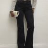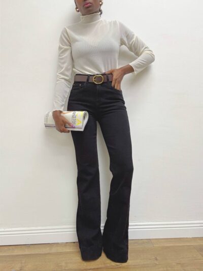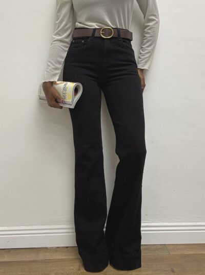 Riscopri il fascino intramontabile del denim sartoriale con questi jeans flare a vita alta, un omaggio sofisticato agli anni ’70 reinterpretato in chiave contemporanea. Realizzati in un denim nero compatto, questi jeans donano una silhouette slanciata e femminile, grazie alla vita alta che valorizza il punto vita e alla gamba che si apre dolcemente a campana.