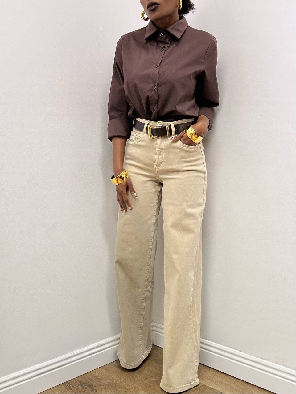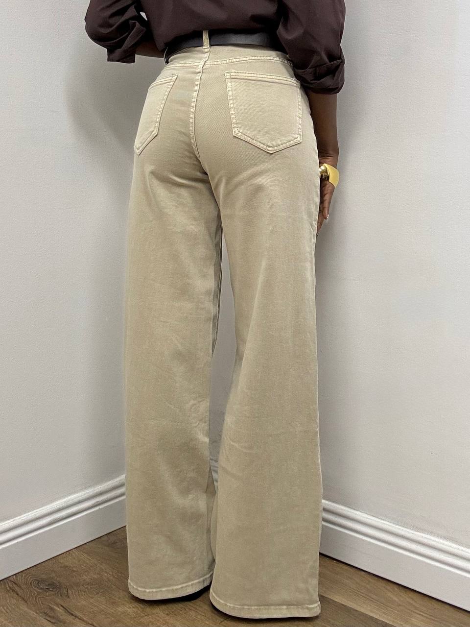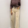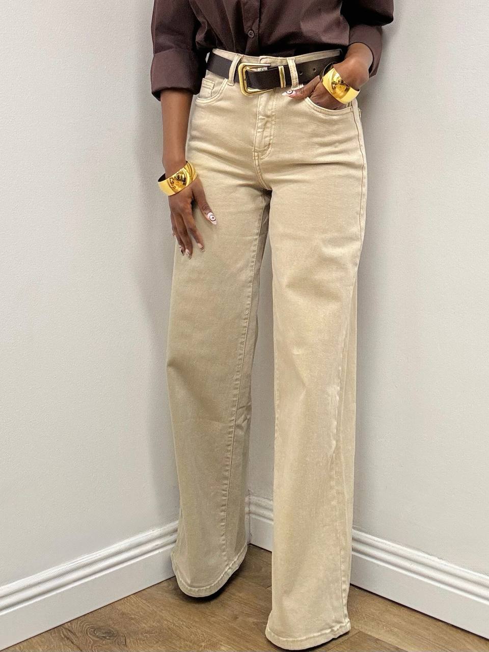 Jeans a vita alta dal taglio palazzo, pensato per slanciare la silhouette e offrire una vestibilità confortevole. Il modello è caratterizzato da quattro taschine funzionali, due anteriori e due posteriori, che aggiungono un dettaglio pratico e stilistico. Chiusura frontale con bottone e zip, per un look essenziale e versatile, ideale da indossare sia di giorno che di sera .Veste mezza taglia in meno.
