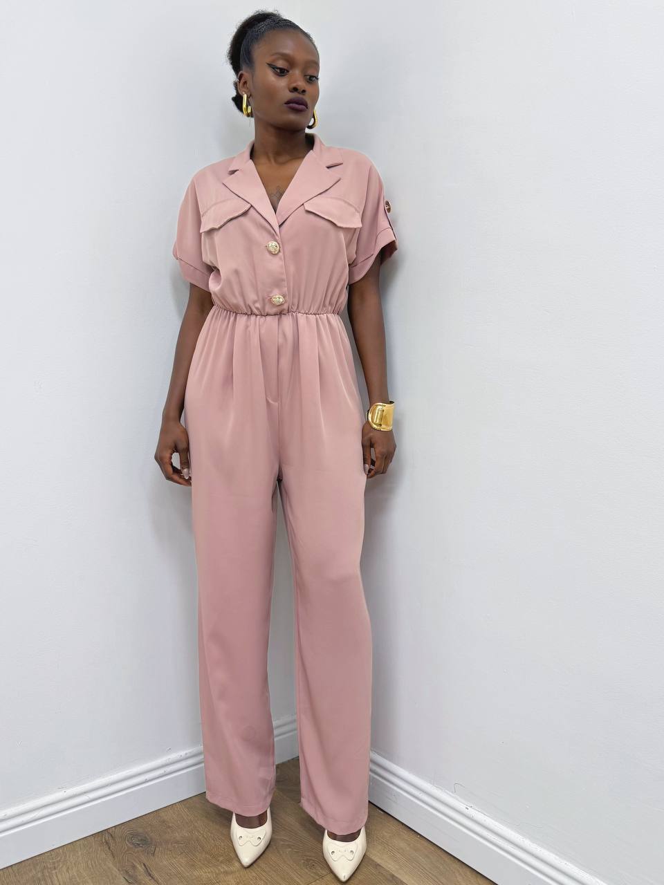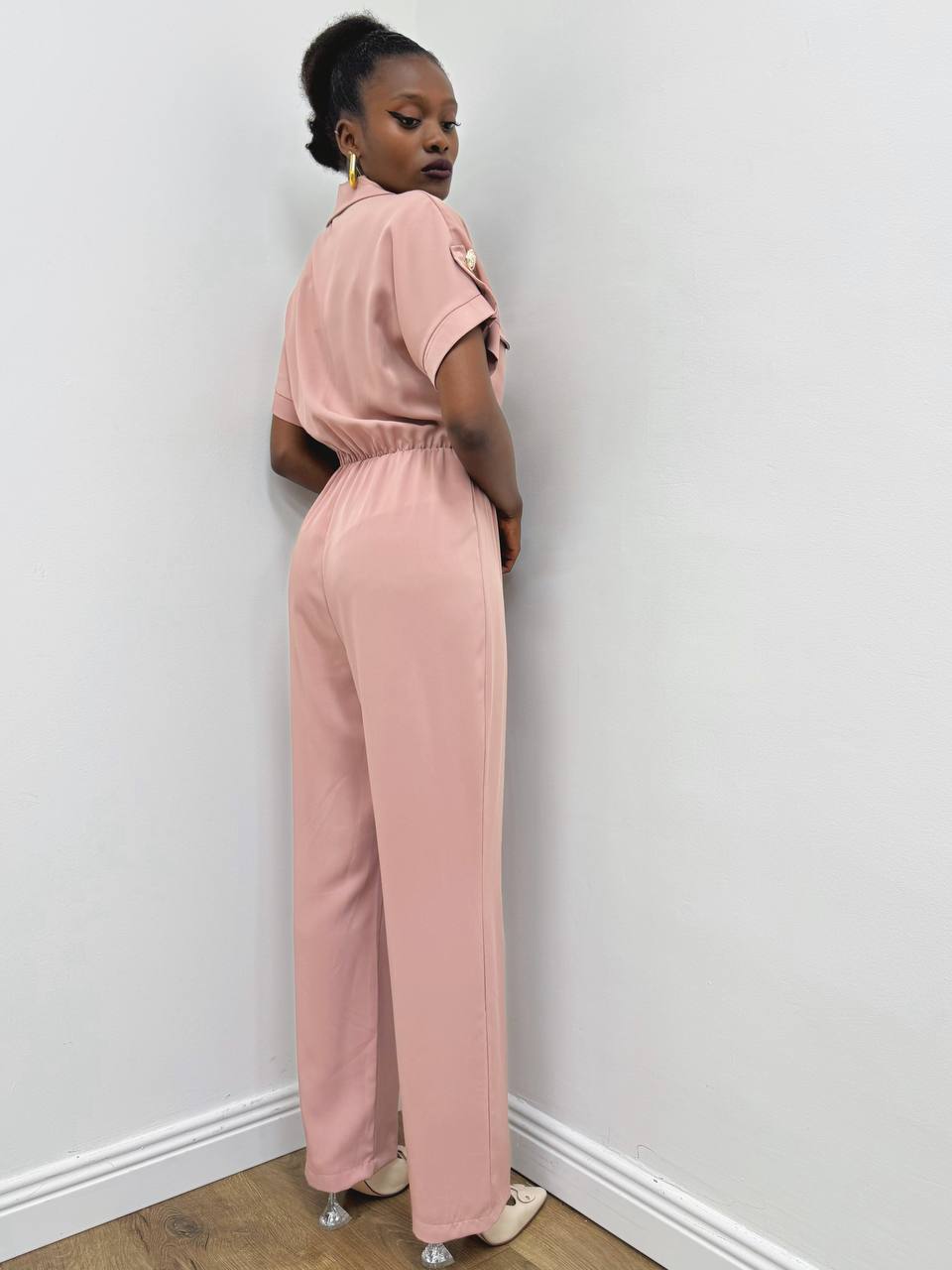 Jumpsuite a manica corta con dettaglio di bottone gioiello con pantalone a palazzo. Elasticizzato sul punto vita.