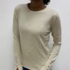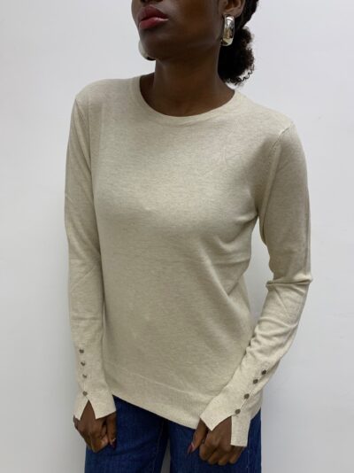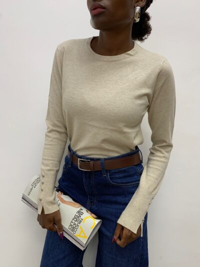Elegante e versatile, questa maglia a tinta unita è realizzata in un tessuto elasticizzato che garantisce comfort e vestibilità perfetta. Il design a girocollo si abbina facilmente a ogni look, mentre il dettaglio di tre bottoni decorativi sulle maniche aggiunge un tocco di stile raffinato. Ideale per un outfit casual-chic o per completare un look più formale.