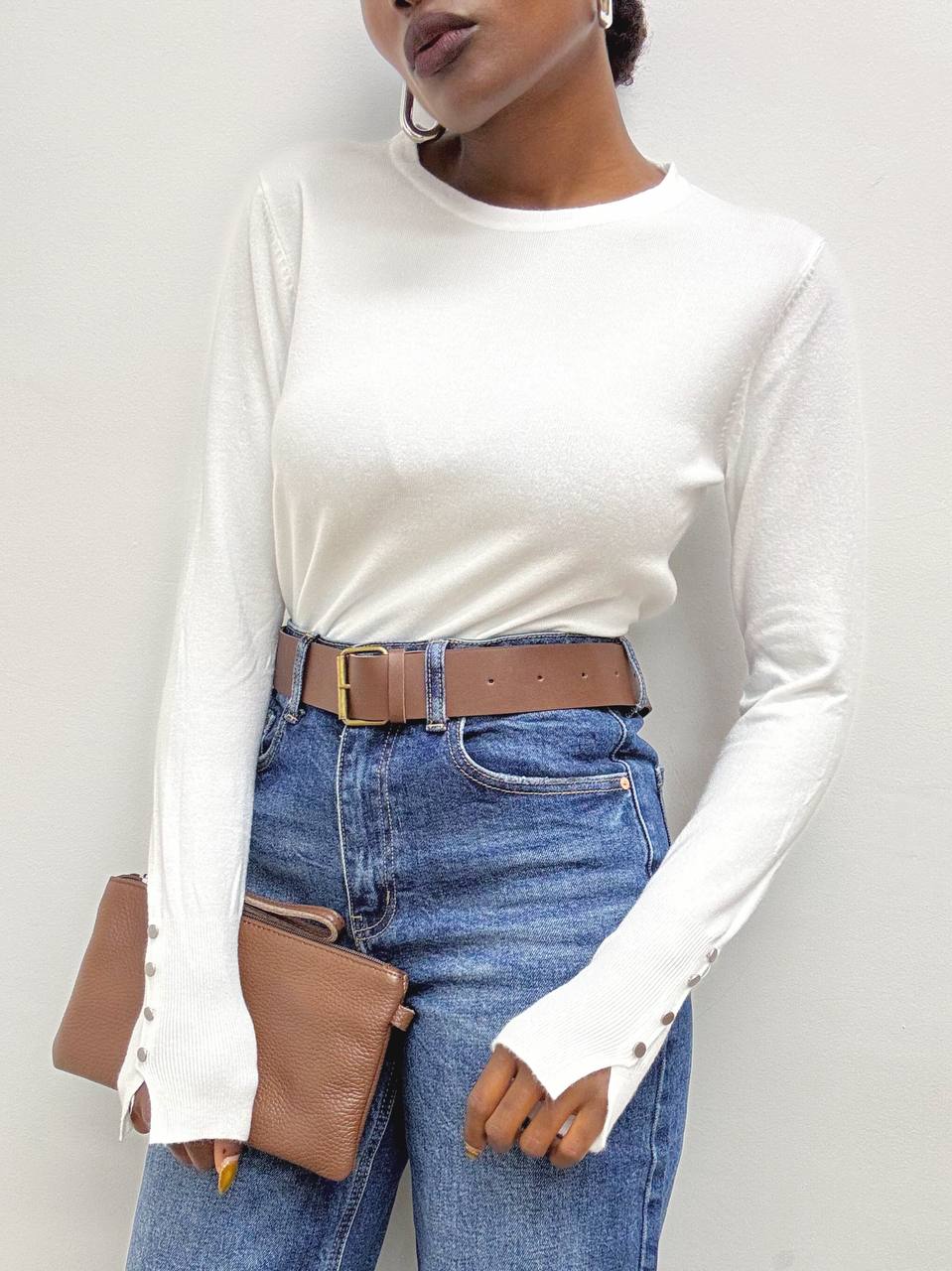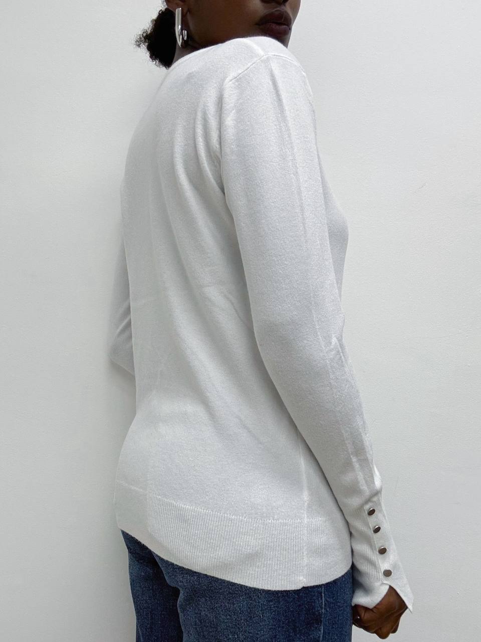Elegante e versatile, questa maglia a tinta unita è realizzata in un tessuto elasticizzato che garantisce comfort e vestibilità perfetta. Il design a girocollo si abbina facilmente a ogni look, mentre il dettaglio di tre bottoni decorativi sulle maniche aggiunge un tocco di stile raffinato. Ideale per un outfit casual-chic o per completare un look più formale.