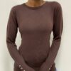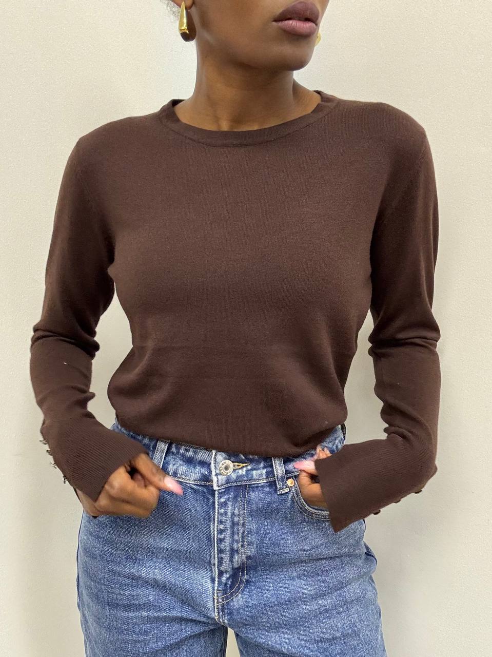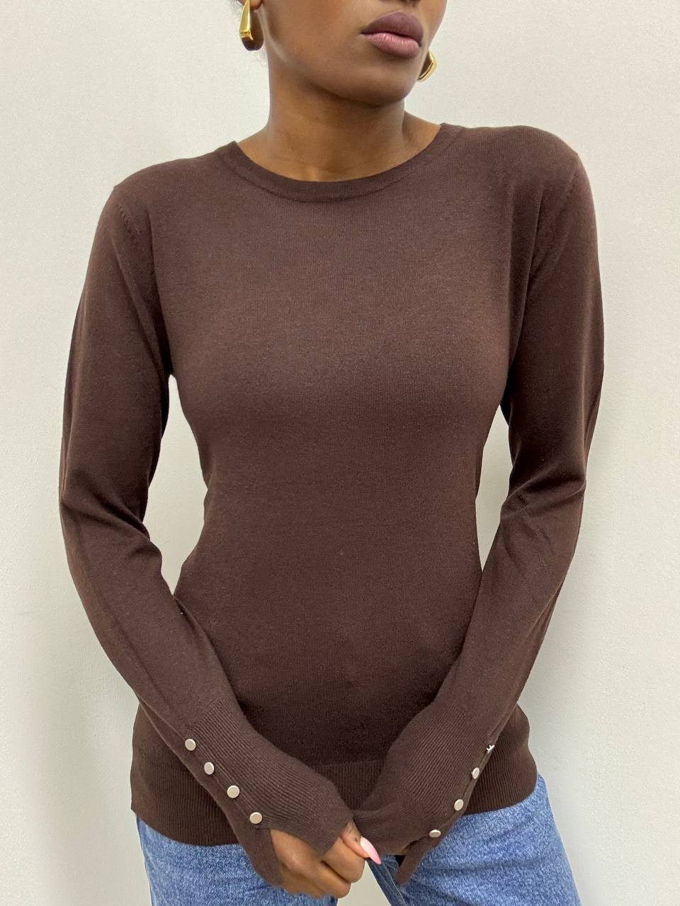 Elegante e versatile, questa maglia a tinta unita è realizzata in un tessuto elasticizzato che garantisce comfort e vestibilità perfetta. Il design a girocollo si abbina facilmente a ogni look, mentre il dettaglio di tre bottoni decorativi sulle maniche aggiunge un tocco di stile raffinato. Ideale per un outfit casual-chic o per completare un look più formale.