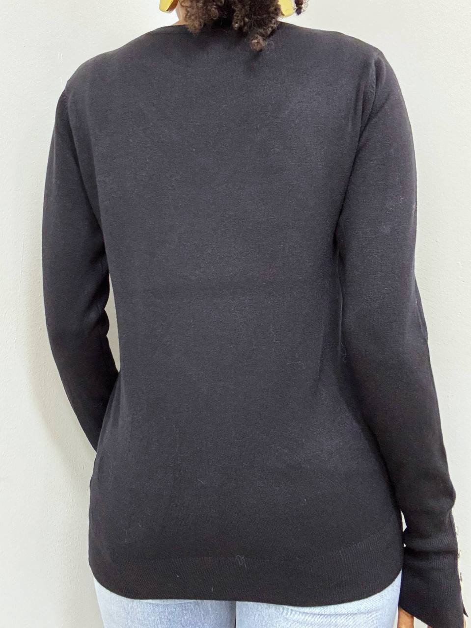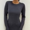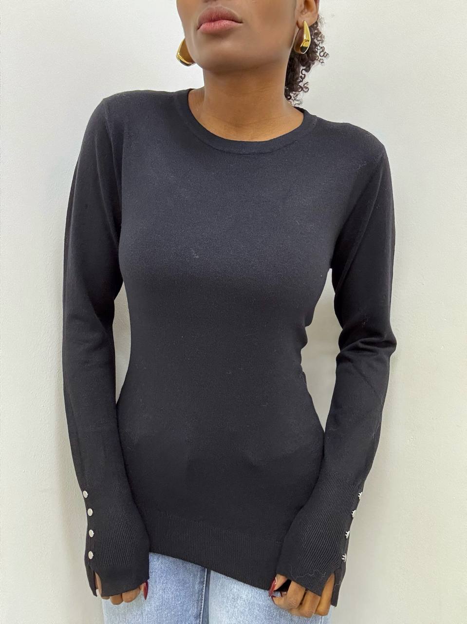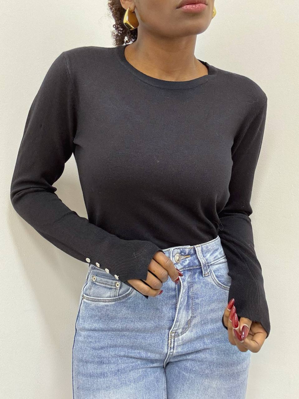 Elegante e versatile, questa maglia a tinta unita è realizzata in un tessuto elasticizzato che garantisce comfort e vestibilità perfetta. Il design a girocollo si abbina facilmente a ogni look, mentre il dettaglio di tre bottoni decorativi sulle maniche aggiunge un tocco di stile raffinato. Ideale per un outfit casual-chic o per completare un look più formale.