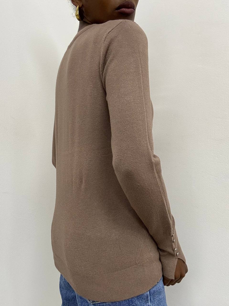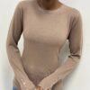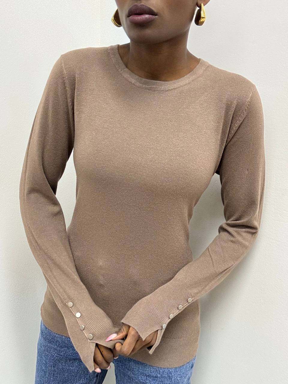 Elegante e versatile, questa maglia a tinta unita è realizzata in un tessuto elasticizzato che garantisce comfort e vestibilità perfetta. Il design a girocollo si abbina facilmente a ogni look, mentre il dettaglio di tre bottoni decorativi sulle maniche aggiunge un tocco di stile raffinato. Ideale per un outfit casual-chic o per completare un look più formale