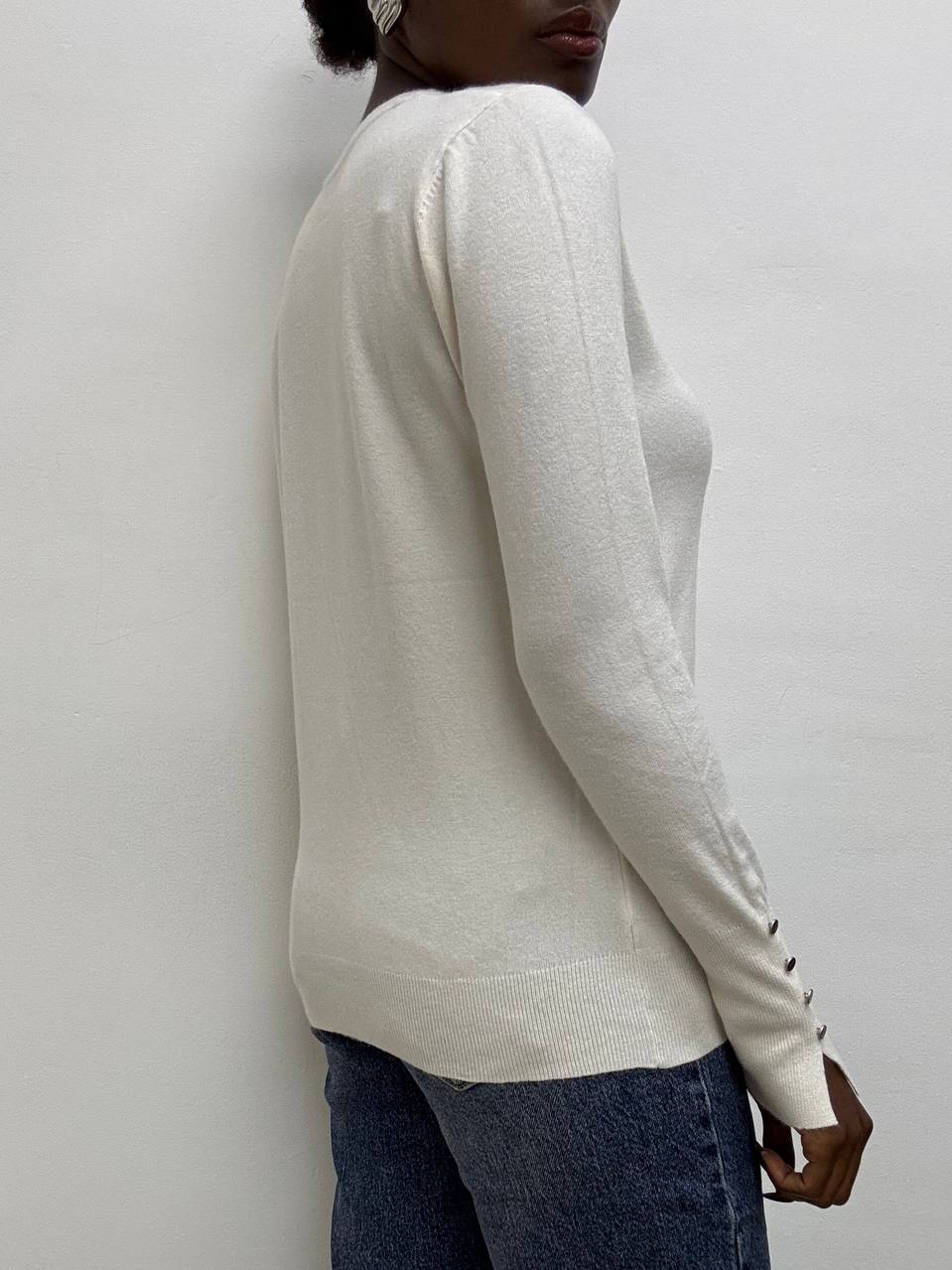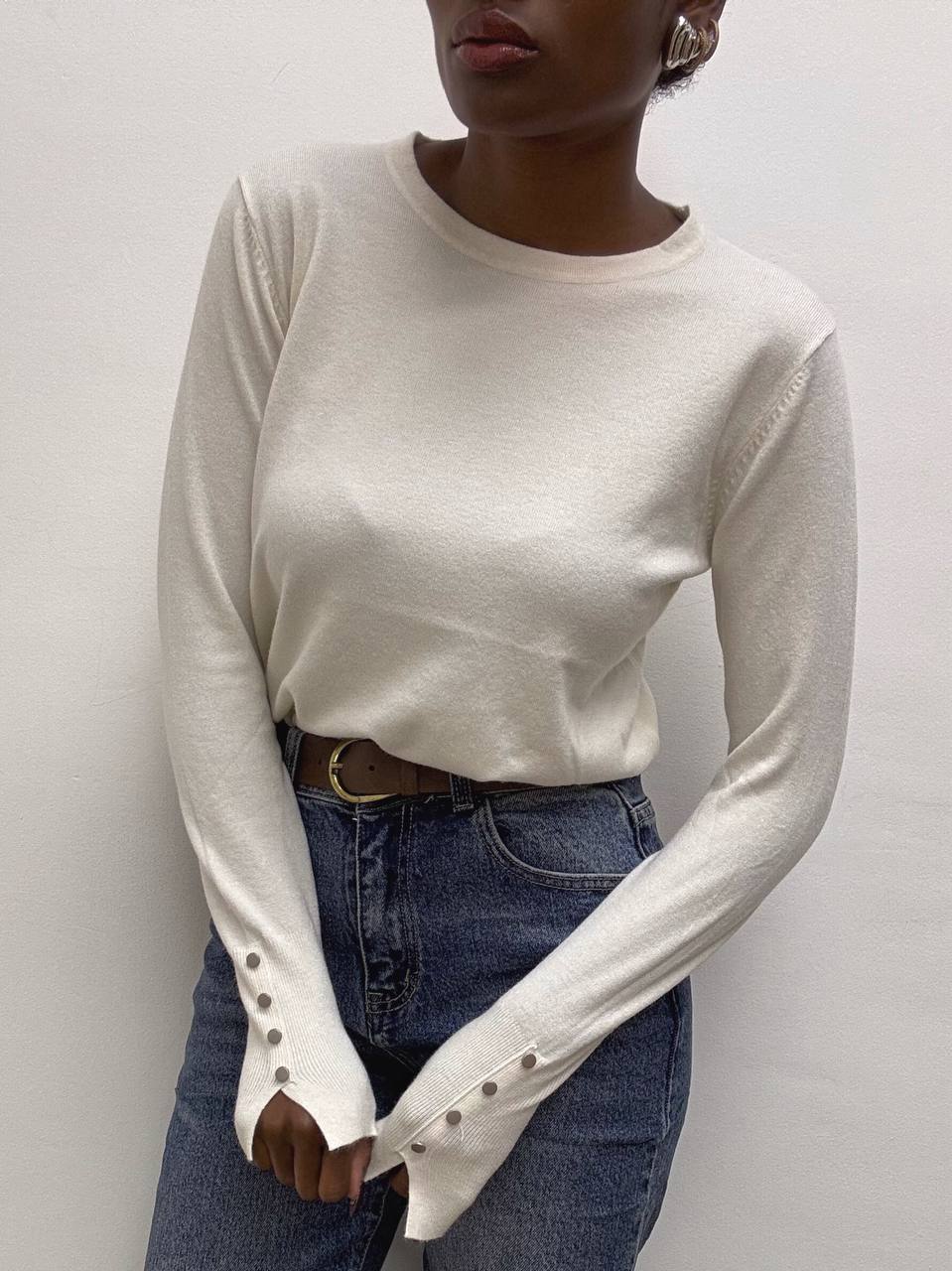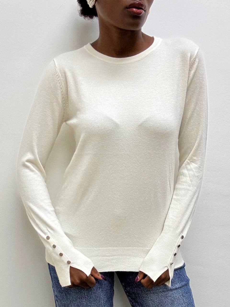 Elegante e versatile, questa maglia a tinta unita è realizzata in un tessuto elasticizzato che garantisce comfort e vestibilità perfetta. Il design a girocollo si abbina facilmente a ogni look, mentre il dettaglio di tre bottoni decorativi sulle maniche aggiunge un tocco di stile raffinato. Ideale per un outfit casual-chic o per completare un look più formale