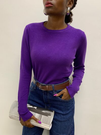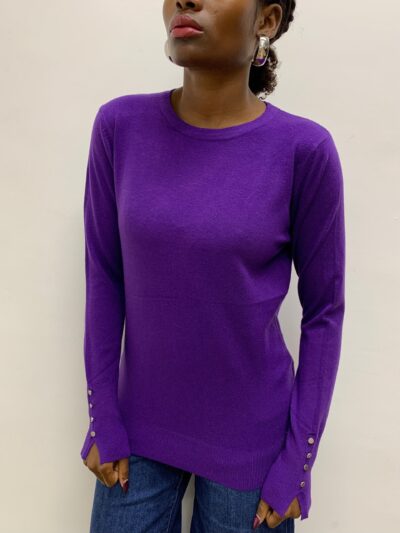 Elegante e versatile, questa maglia a tinta unita è realizzata in un tessuto elasticizzato che garantisce comfort e vestibilità perfetta. Il design a girocollo si abbina facilmente a ogni look, mentre il dettaglio di quattro bottoni decorativi sulle maniche aggiunge un tocco di stile raffinato. Ideale per un outfit casual-chic o per completare un look più formale.