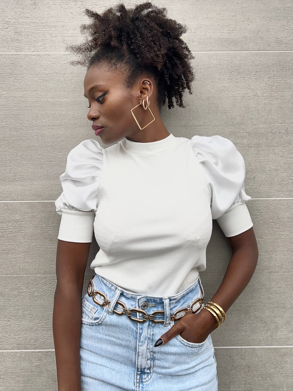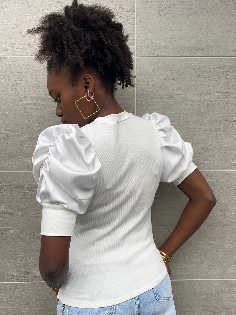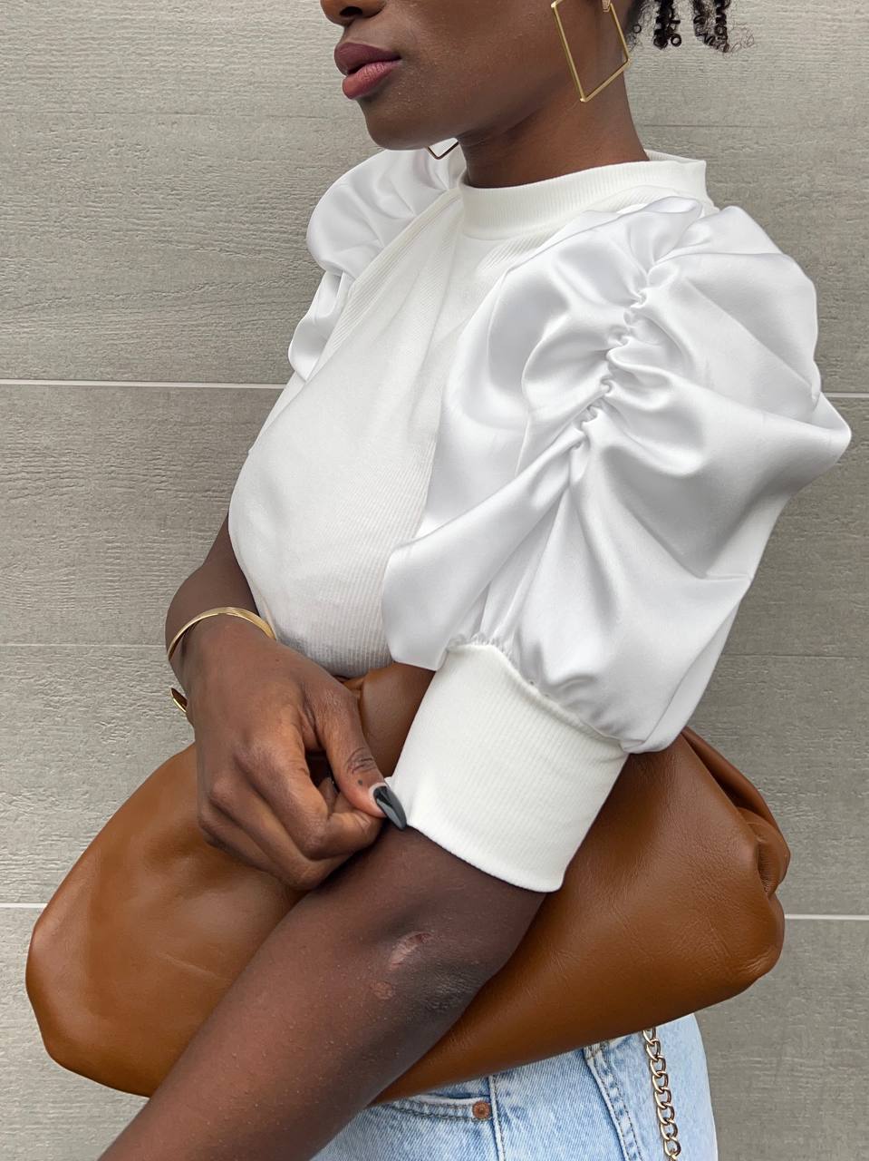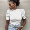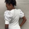 Maglia a girocollo con doppio tessuto con manica a sbuffo in satin con trama a costine.
