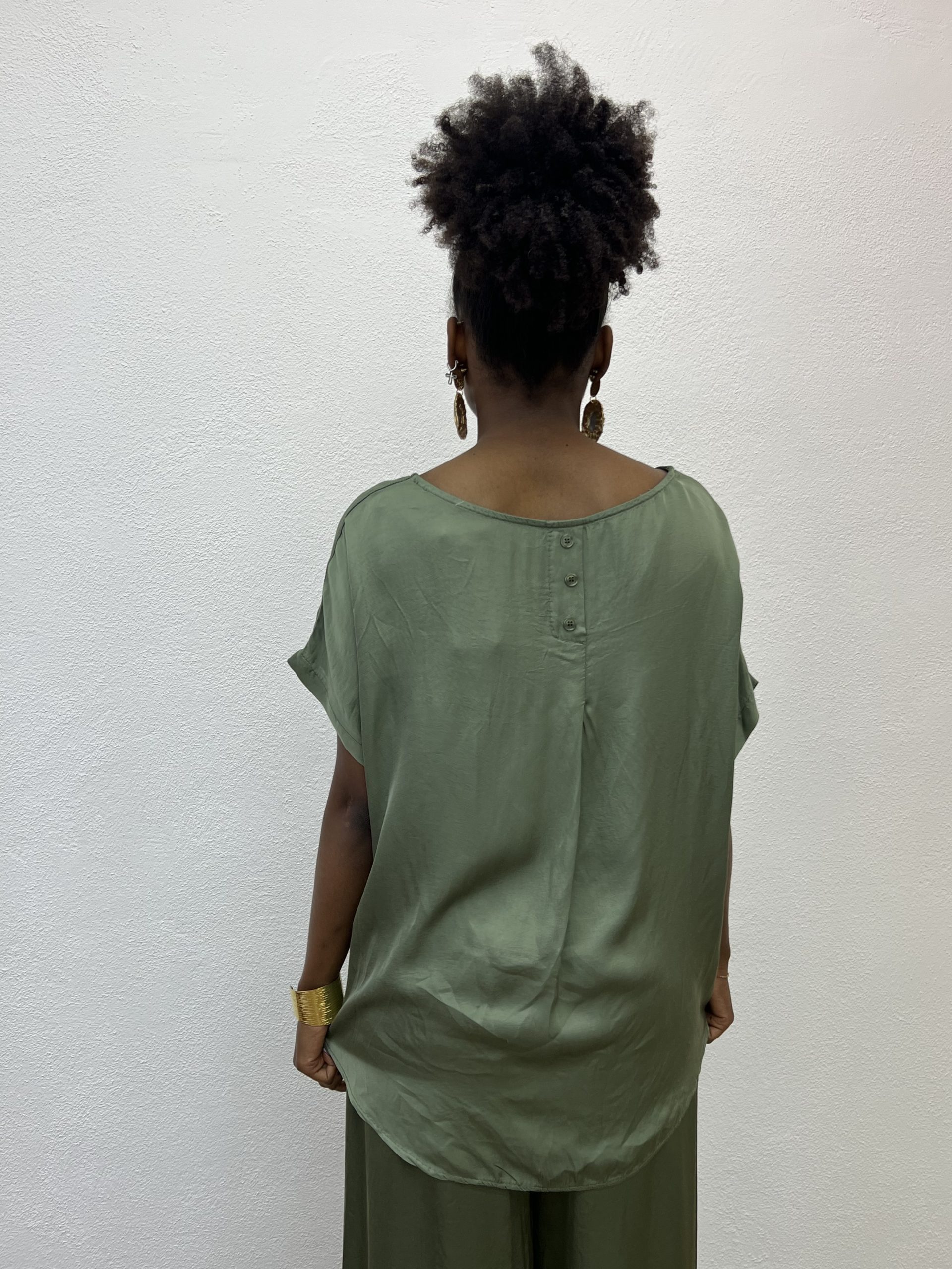 Maglia completamente morbida con scollo a barca sulla parte finale leggermente più lungo rispetto al davanti sulla parte posteriore dettaglio di tre bottoncini