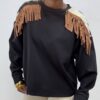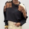 Il taglio classico a girocollo è valorizzato da un design originale, le spalle sono impreziosite da inserti animalier che aggiungono un twist audace e contemporaneo con dettaglio di frange cucite in tonalità camel ,creano movimento e personalità ad ogni passo. Un capo versatile e di carattere, ideale per chi ama distinguersi con stile.