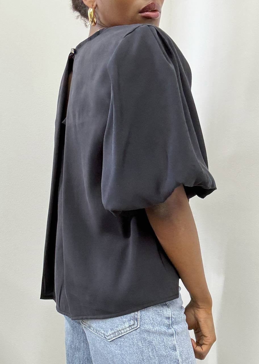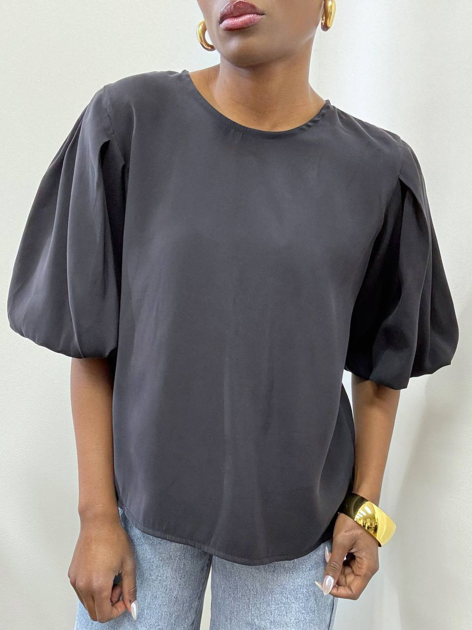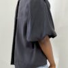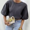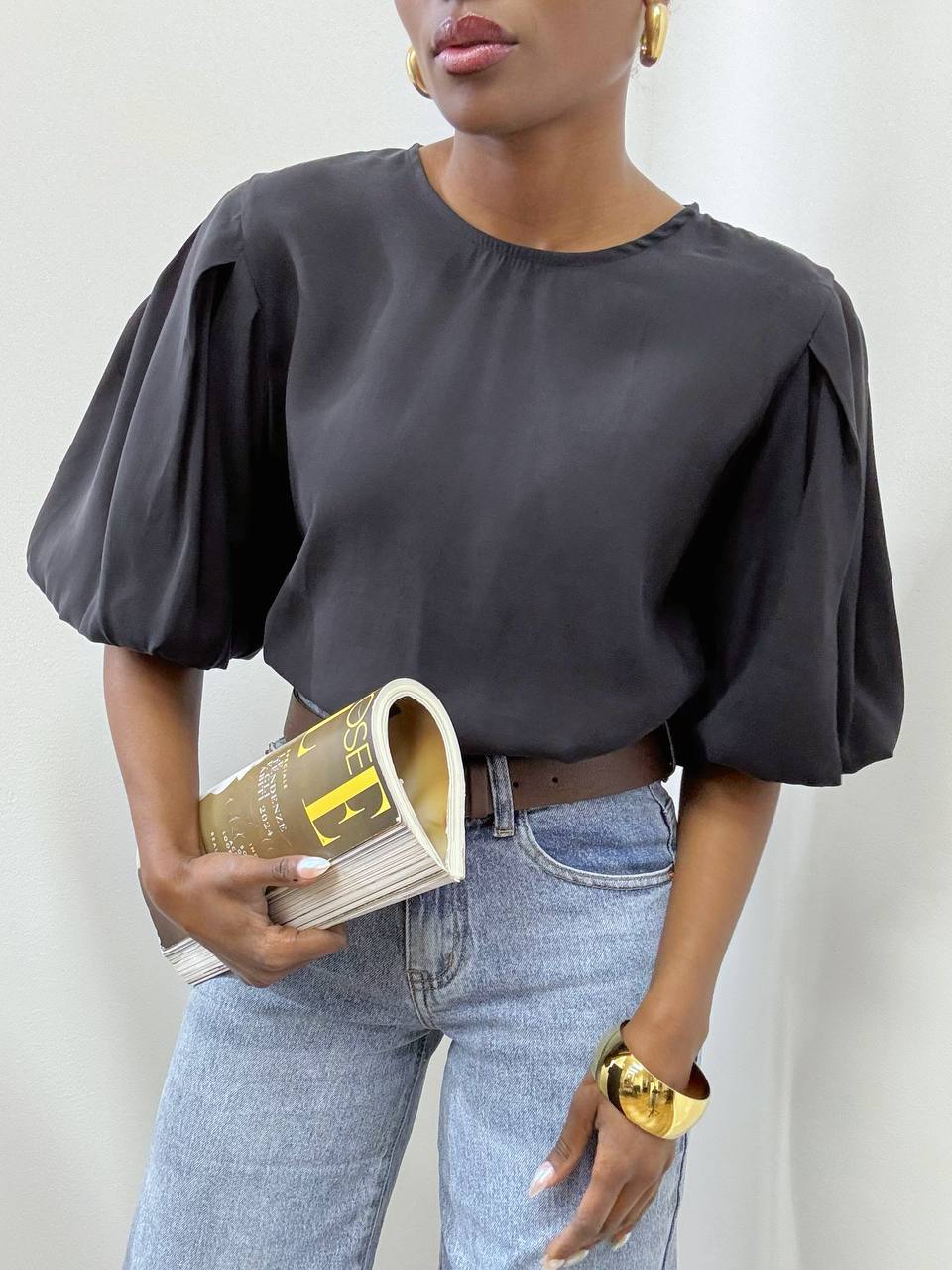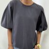 Maglia a tinta unita dal design sofisticato e contemporaneo, impreziosita da eleganti maniche a sbuffo che aggiungono volume e carattere al capo. Le maniche sono rifinite con polsini elasticizzati che creano un delicato effetto arricciato, valorizzando la figura e garantendo una vestibilità confortevole.