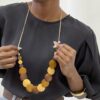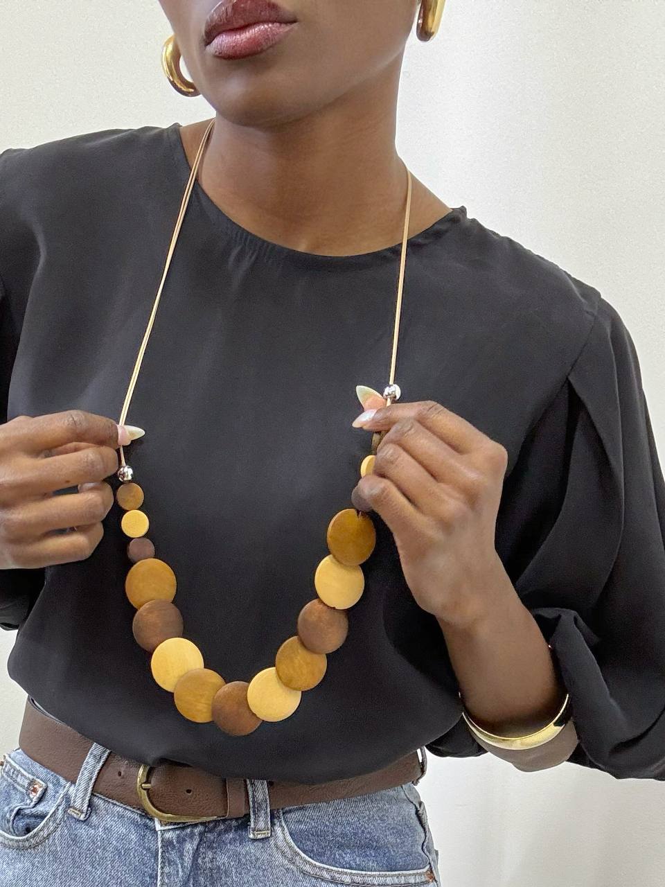 Il dettaglio distintivo è la collana integrata, armoniosamente incorporata nello scollo, che dona un tocco luminoso e ricercato senza bisogno di accessori aggiuntivi. Questo elemento decorativo esalta il décolleté e rende la maglia perfetta anche per occasioni più eleganti.