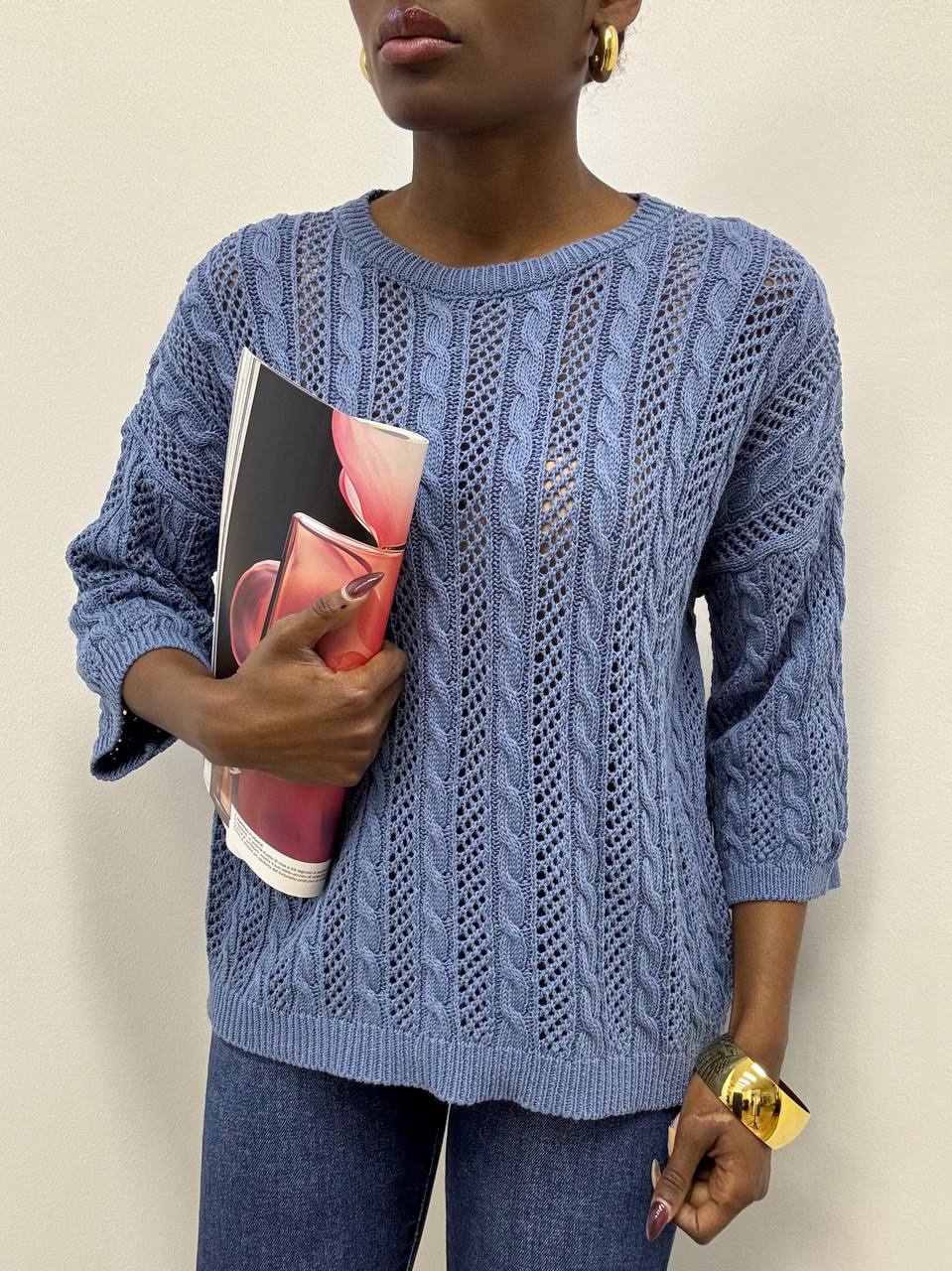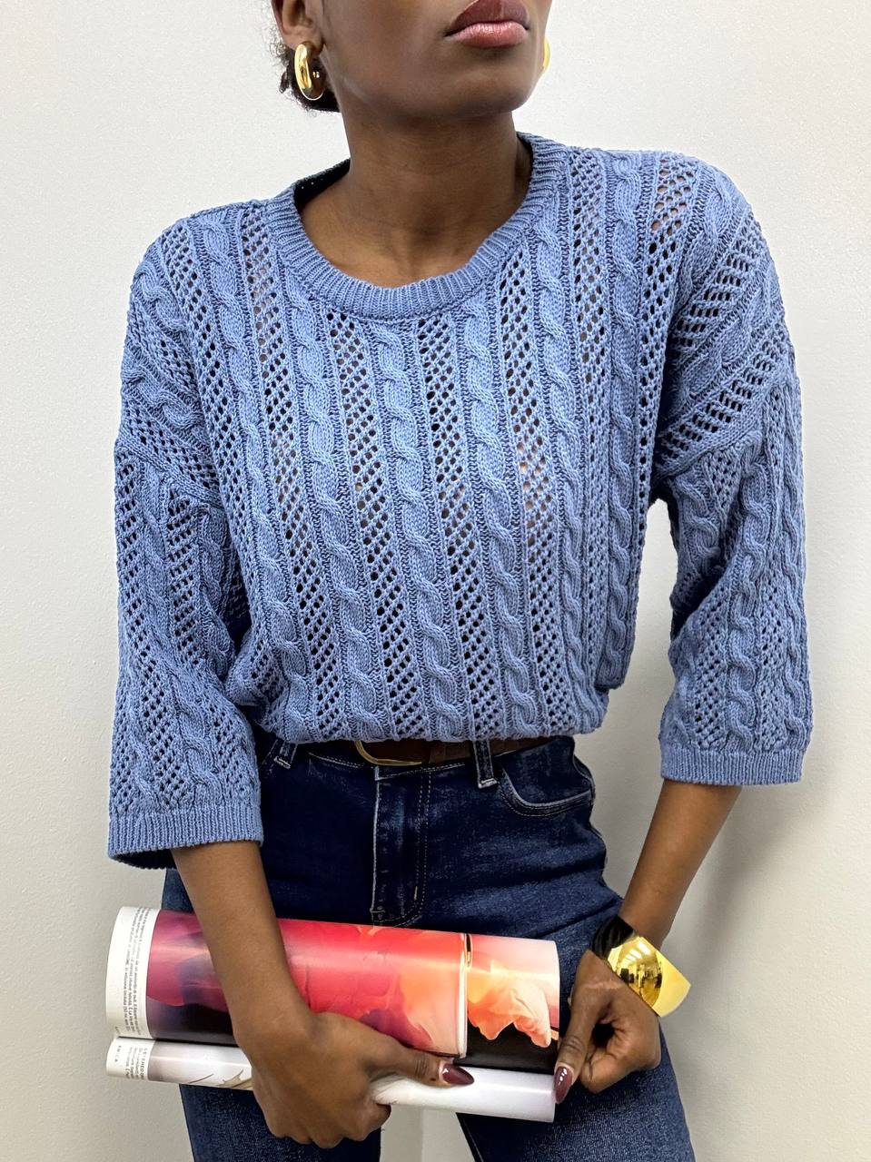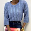 Maglia intrecciata a girocollo dal design elegante e contemporaneo. Realizzata in tessuto elasticizzato, avvolge delicatamente la silhouette garantendo comfort e libertà di movimento. La lavorazione intrecciata dona texture e carattere al capo, creando un raffinato gioco di rilievi. Il girocollo classico valorizza il décolleté con semplicità, mentre le maniche a tre quarti aggiungono un tocco femminile e versatile, perfetto per ogni stagione. Ideale da indossare sia con look casual che più ricercati, è un capo essenziale dal fascino senza tempo.