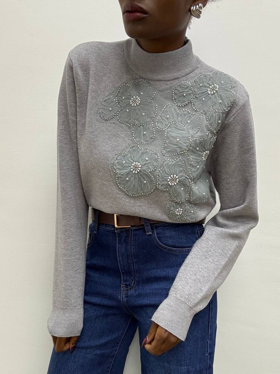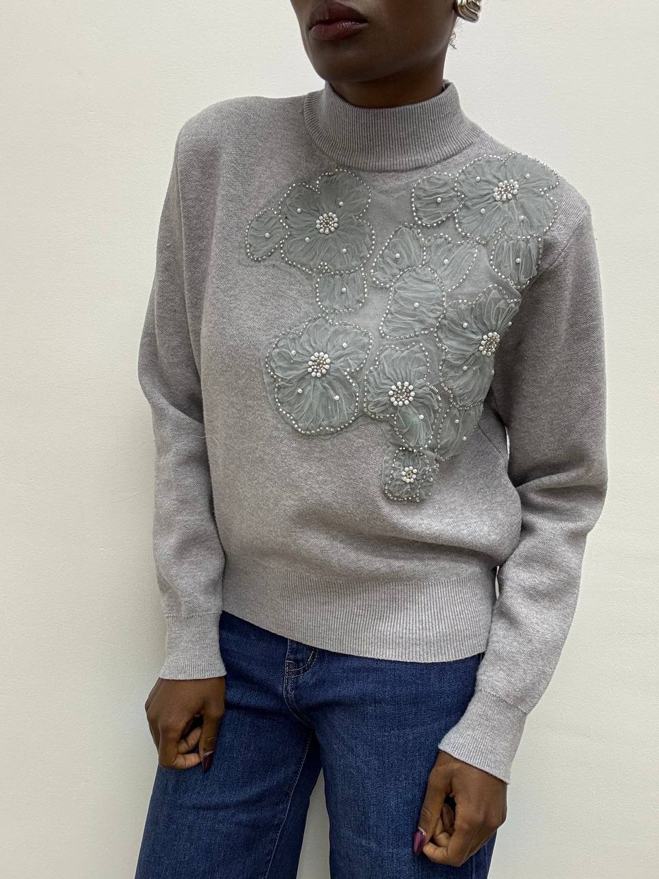 Il dettaglio decorativo con fiorellini impreziositi da strass che donano luminosità e rende il capo ideale sia per un look casual chic che per un’occasione speciale.