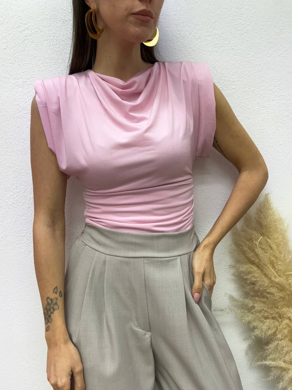 Maglia smanicata arricciata con spallina insellata a tinta unita.