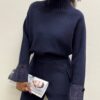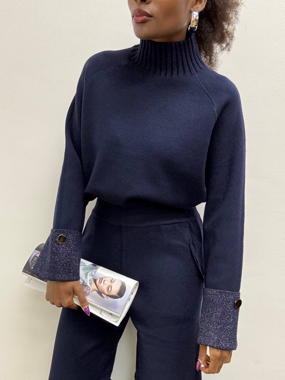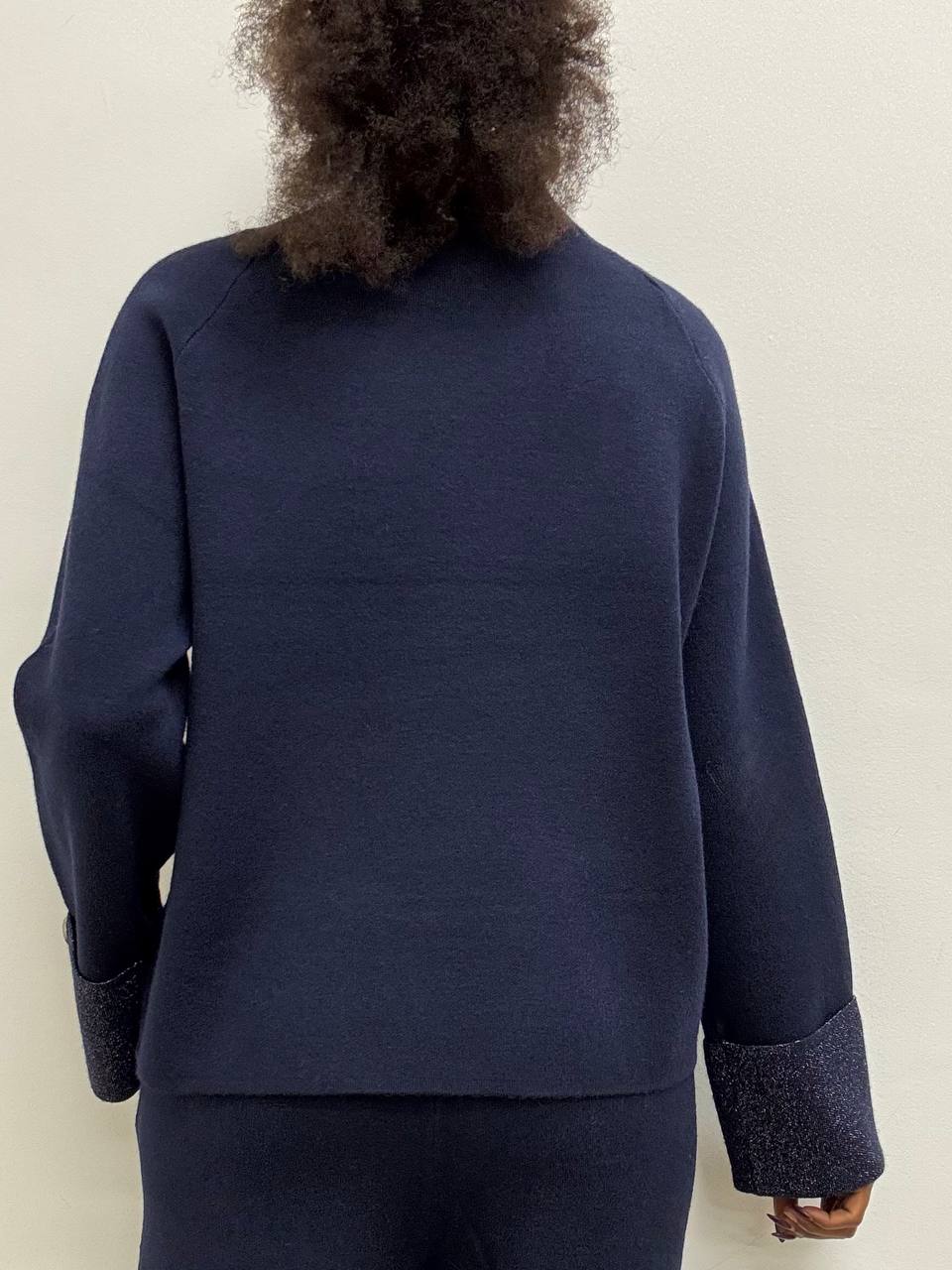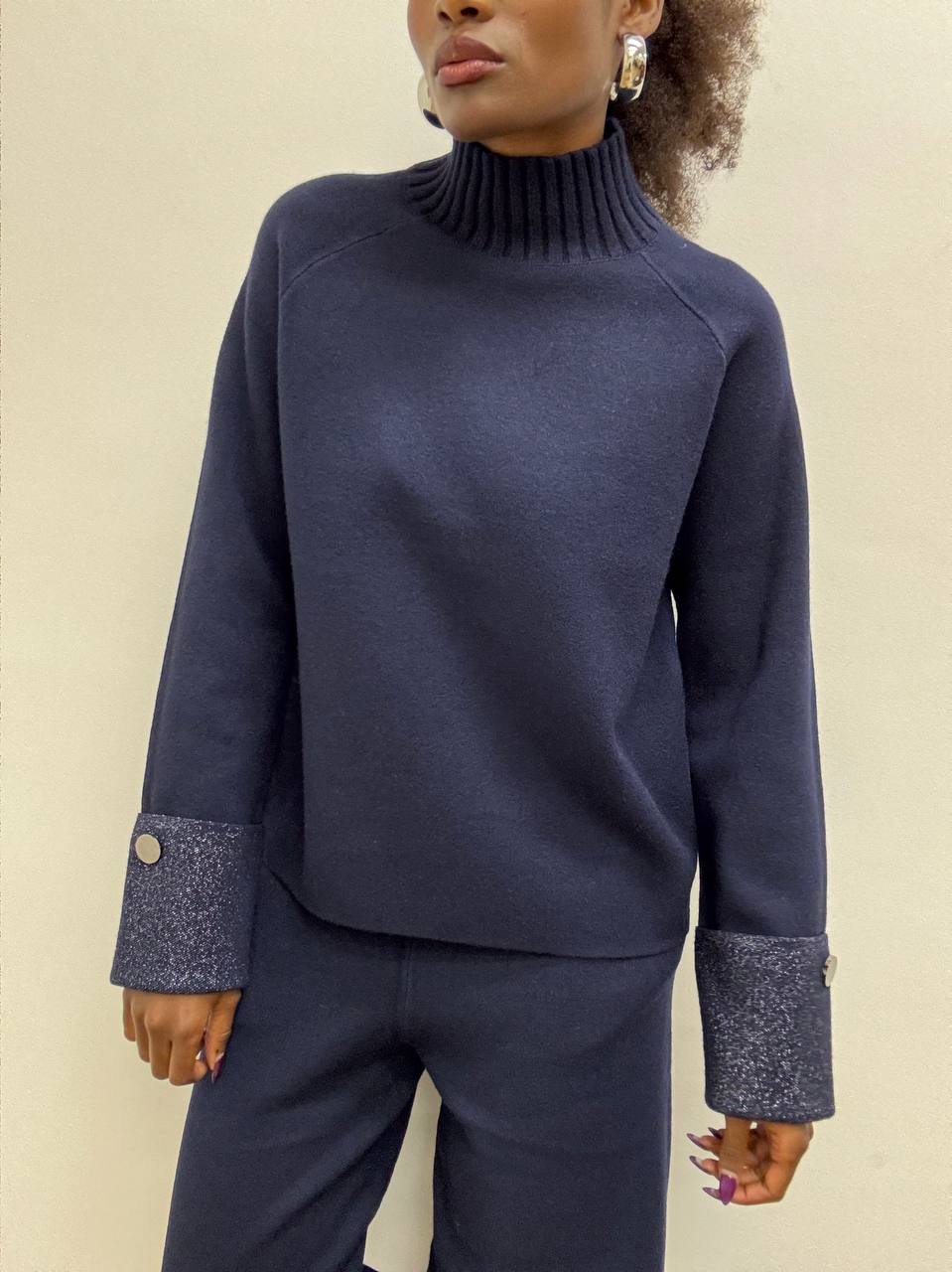 Maglia dal taglio essenziale ma impreziosita da dettagli luminosi, realizzata in un morbida mista viscosa che assicura comfort, elasticità e una vestibilità fluida. Il collo alto elasticizzato avvolge delicatamente il collo, conferendo al capo un tocco raffinato e ideale per la stagione più fresca. A rendere unico il design è la manica laminata risvoltata in lurex con dettaglio di bottoncino. Questo maglia è perfetta per elevare anche i look più minimal. Versatile e femminile, è il capo ideale da indossare sia di giorno con un jeans, sia di sera abbinato a capi più eleganti. Pancino compatibile.