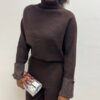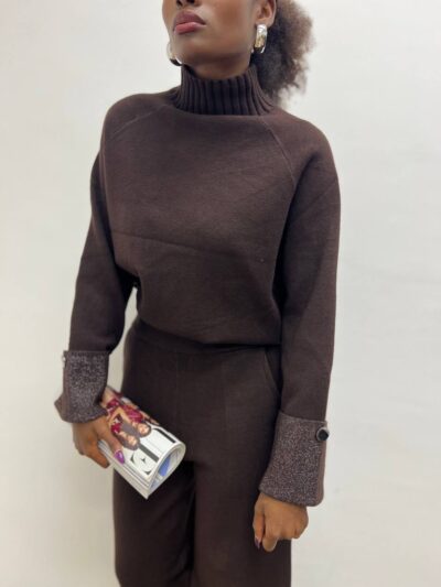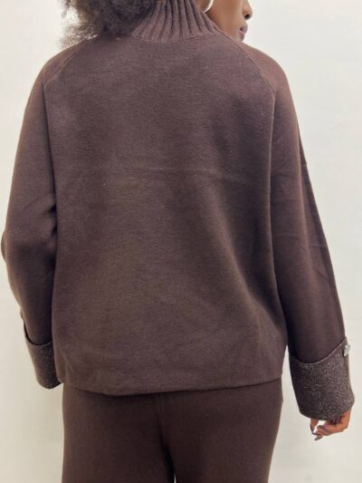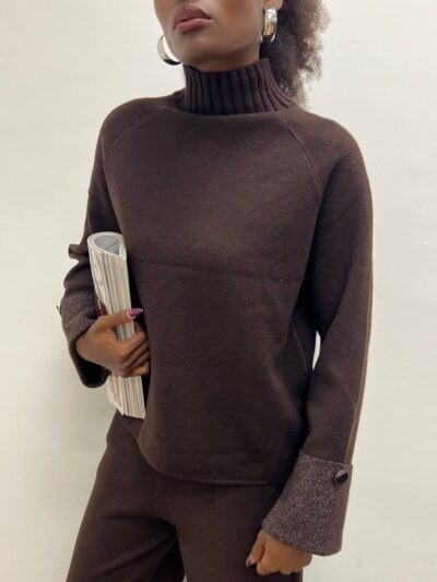 Maglioncino dal taglio essenziale ma impreziosito da dettagli luminosi, realizzato in un morbido misto viscosa che assicura comfort, elasticità e una vestibilità fluida. Il collo alto elasticizzato avvolge delicatamente il collo, conferendo al capo un tocco raffinato e ideale per la stagione più fresca. A rendere unico il design è la manica laminata risvoltata in lurex con dettaglio di bottoncino. Questo maglioncino è perfetto per elevare anche i look più minimal. Versatile e femminile, è il capo ideale da indossare sia di giorno con un jeans, sia di sera abbinato a capi più eleganti. Pancino compatibile.