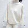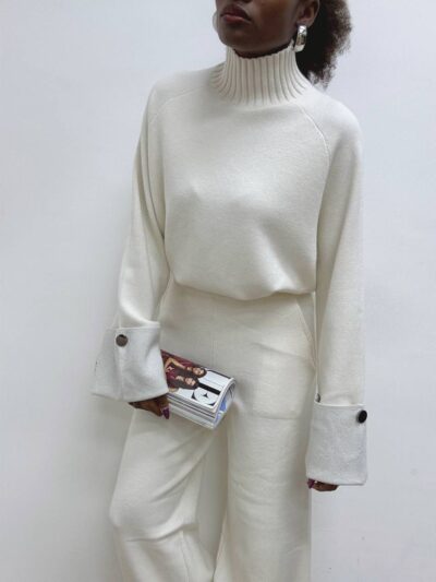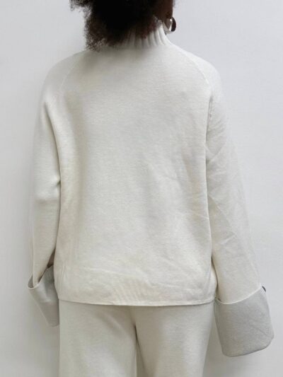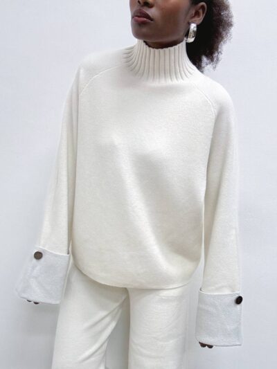Maglia dal taglio essenziale ma impreziosita da dettagli luminosi, realizzata in un morbida mista viscosa che assicura comfort, elasticità e una vestibilità fluida. Il collo alto elasticizzato avvolge delicatamente il collo, conferendo al capo un tocco raffinato e ideale per la stagione più fresca. A rendere unico il design è la manica laminata risvoltata in lurex con dettaglio di bottoncino. Questo maglia è perfetta per elevare anche i look più minimal. Versatile e femminile, è il capo ideale da indossare sia di giorno con un jeans, sia di sera abbinato a capi più eleganti. Pancino compatibile.