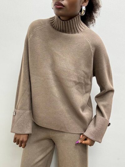 Maglioncino dal taglio essenziale ma impreziosito da dettagli luminosi, realizzato in un morbido misto viscosa che assicura comfort, elasticità e una vestibilità fluida. Il collo alto elasticizzato avvolge delicatamente il collo, conferendo al capo un tocco raffinato e ideale per la stagione più fresca. A rendere unico il design è la manica laminata risvoltata in lurex con dettaglio di bottoncino. Questo maglioncino è perfetto per elevare anche i look più minimal. Versatile e femminile, è il capo ideale da indossare sia di giorno con un jeans, sia di sera abbinato a capi più eleganti. Pancino compatibile.