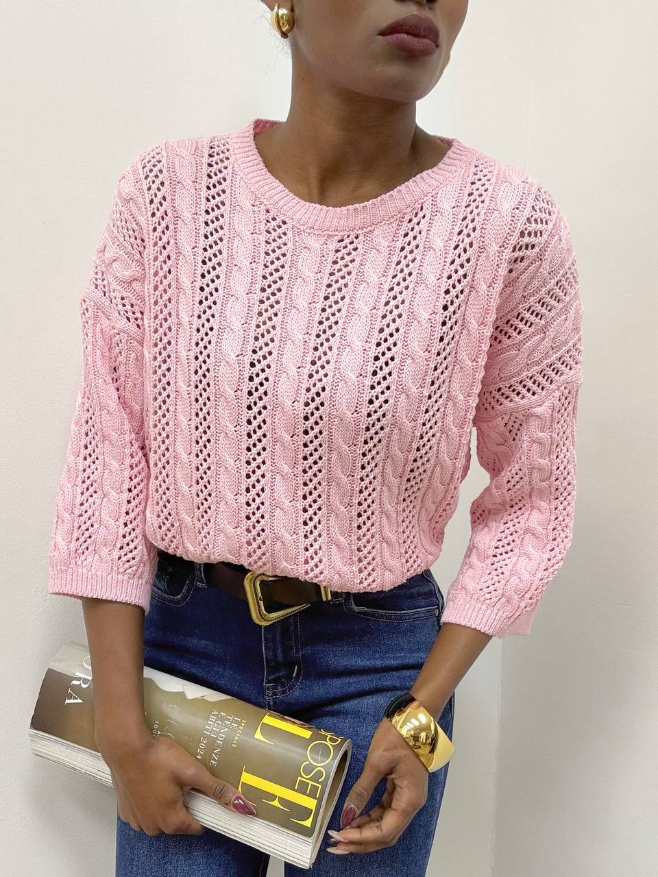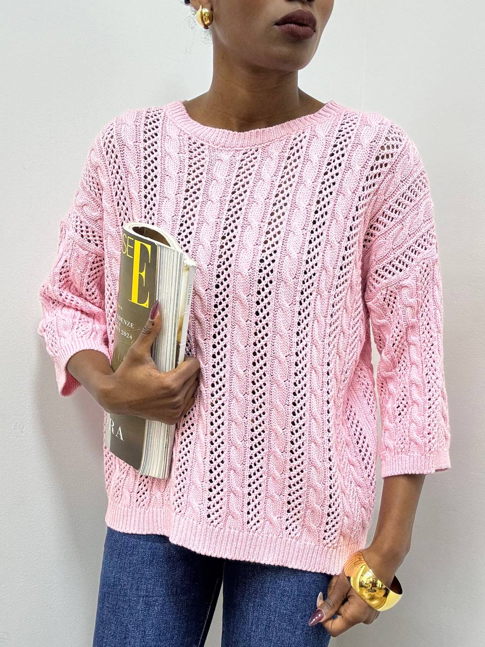 Maglia intrecciata a girocollo dal design elegante e contemporaneo. Realizzata in tessuto elasticizzato, avvolge delicatamente la silhouette garantendo comfort e libertà di movimento. La lavorazione intrecciata dona texture e carattere al capo, creando un raffinato gioco di rilievi. Il girocollo classico valorizza il décolleté con semplicità, mentre le maniche a tre quarti aggiungono un tocco femminile e versatile, perfetto per ogni stagione. Ideale da indossare sia con look casual che più ricercati, è un capo essenziale dal fascino senza tempo.