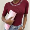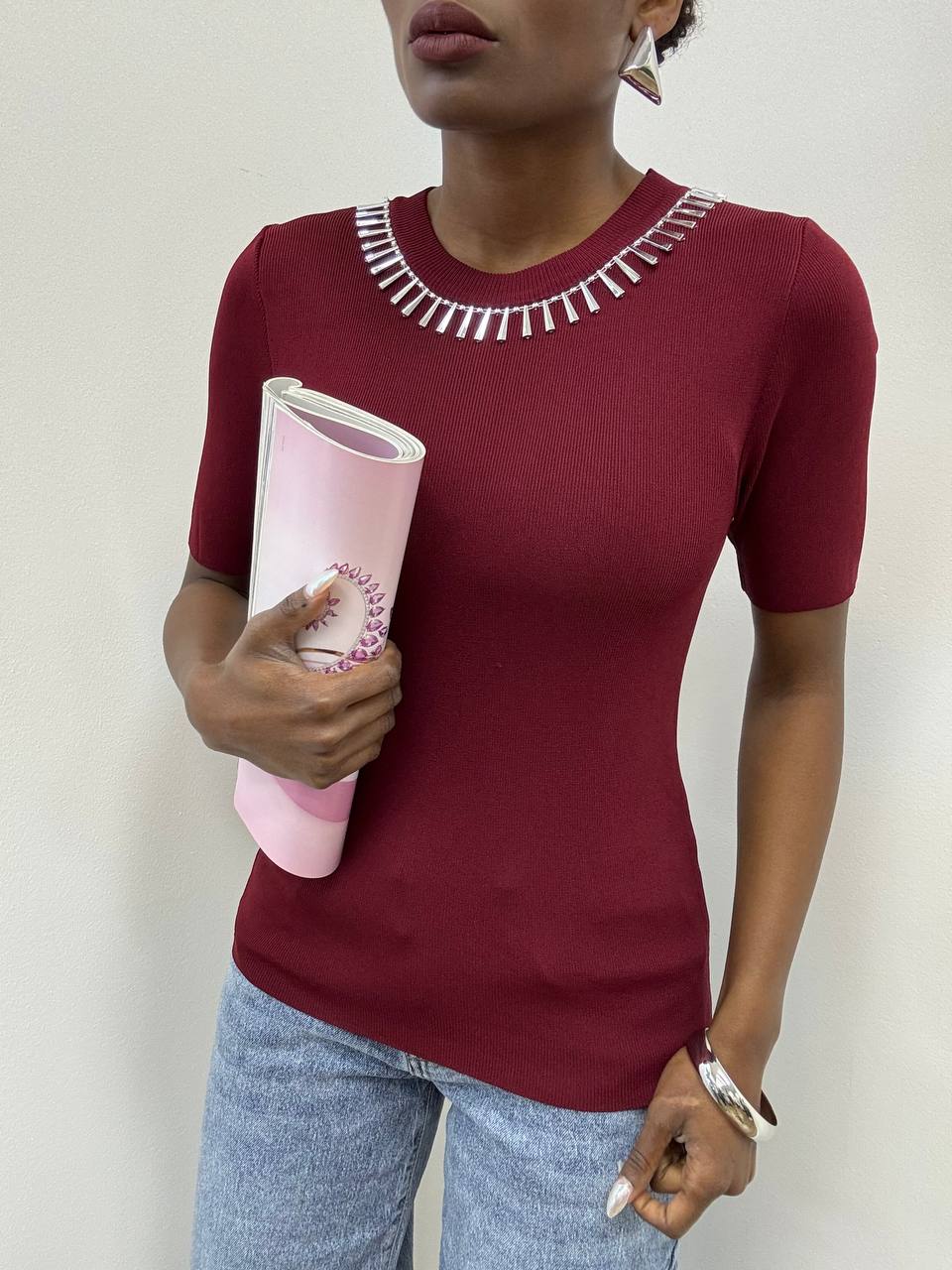 T-shirt a costine dal design essenziale impreziosita da raffinate applicazioni gioiello lungo lo scollo. Un capo che unisce comfort e luminosità, perfetto per aggiungere un tocco chic anche ai look più semplici.