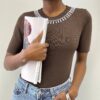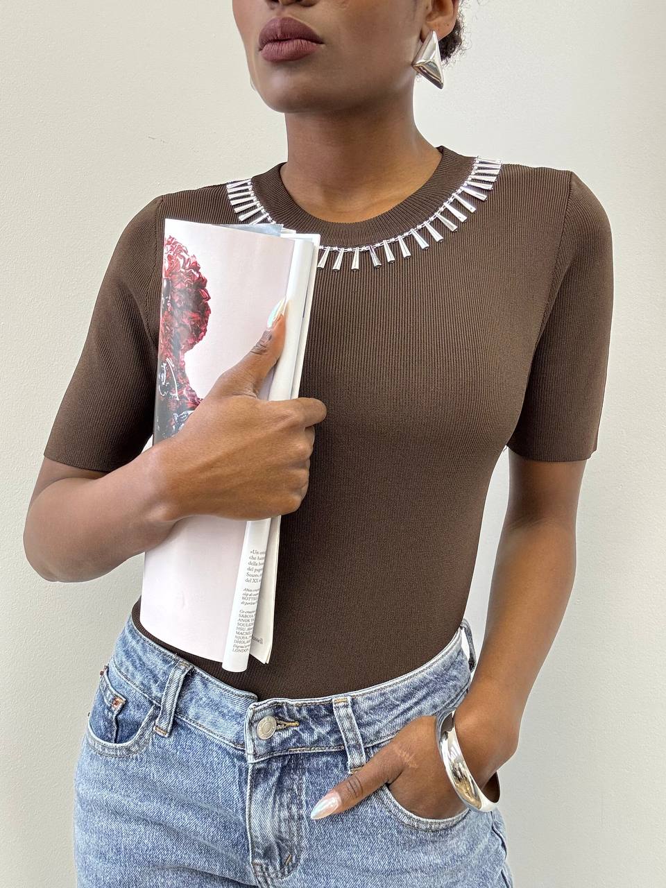 La lavorazione a costine valorizza la silhouette garantendo una vestibilità aderente ma confortevole, mentre i dettagli gioiello catturano la luce e donano un’eleganza discreta. Ideale da indossare sia di giorno, abbinata a denim o pantaloni casual, sia di sera per un outfit più ricercato.