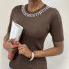 T-shirt a costine dal design essenziale impreziosita da raffinate applicazioni gioiello lungo lo scollo. Un capo che unisce comfort e luminosità, perfetto per aggiungere un tocco chic anche ai look più semplici.