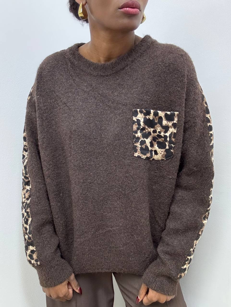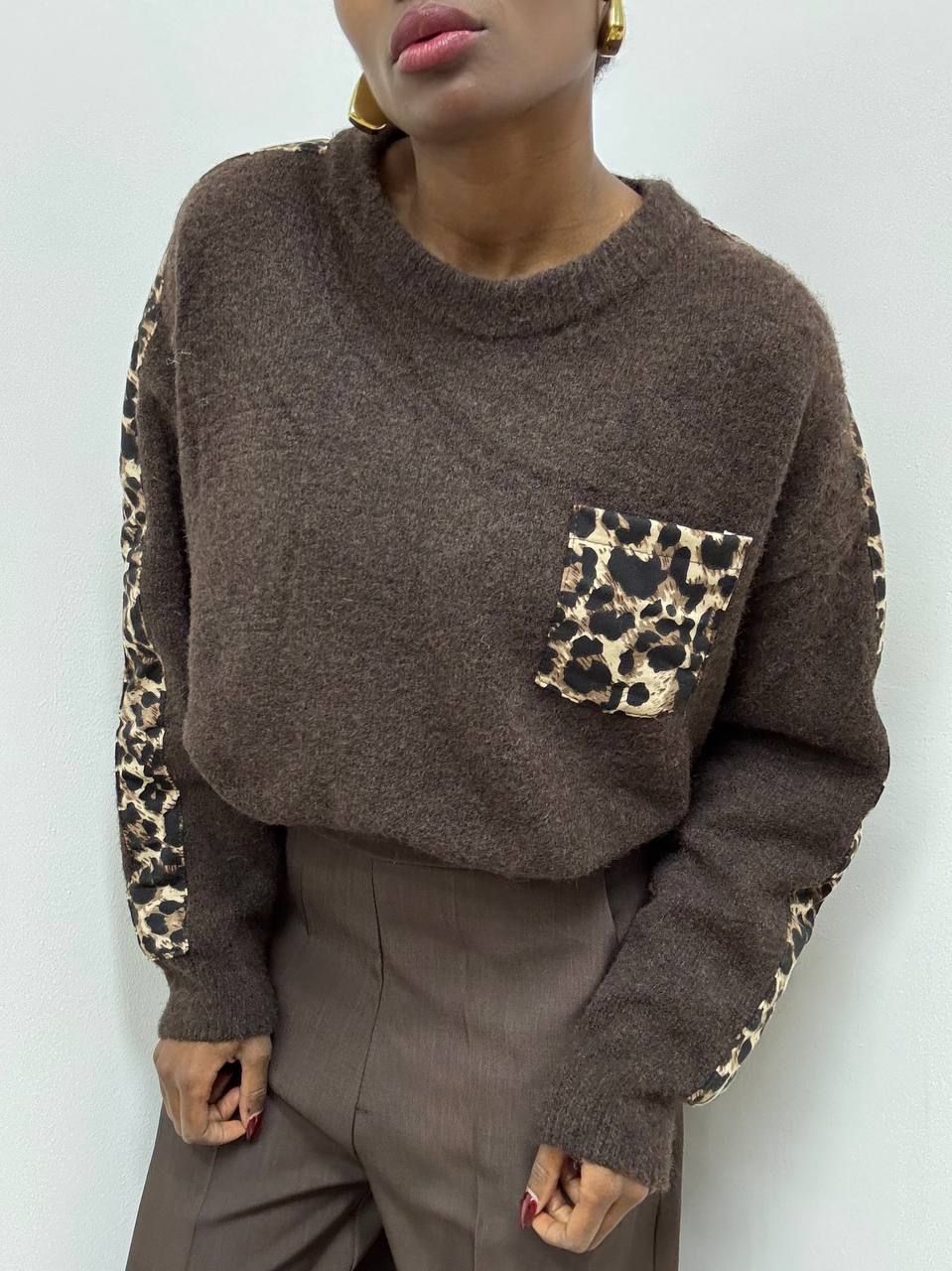 Maglioncino a girocollo realizzato in morbido misto viscosa elasticizzato, pensato per offrire comfort e una vestibilità avvolgente. Il design essenziale è valorizzato da raffinati inserti leopardati che donano carattere e un tocco grintoso al capo. Il taschino frontale coordinato in fantasia leopardata aggiunge un dettaglio ricercato e di tendenza. Ideale da indossare sia in look casual che più curati, questo maglioncino unisce praticità, stile e femminilità.