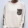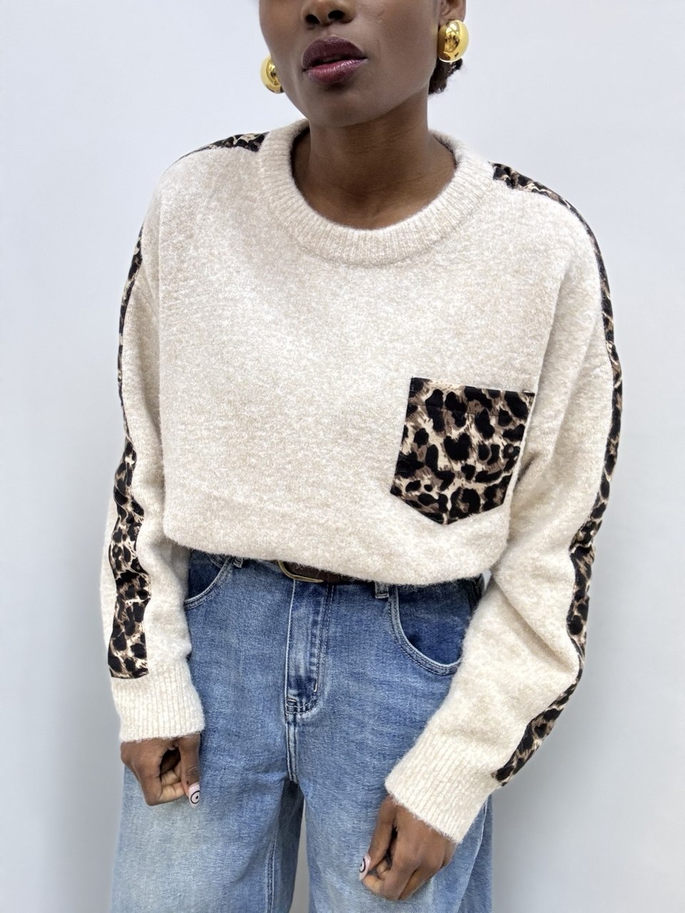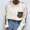 Maglia a girocollo realizzato in morbido misto viscosa elasticizzato, pensato per offrire comfort e una vestibilità avvolgente. Il design essenziale è valorizzato da raffinati inserti leopardati che donano carattere e un tocco grintoso al capo. Il taschino frontale coordinato in fantasia leopardata aggiunge un dettaglio ricercato e di tendenza. Ideale da indossare sia in look casual che più curati, questo maglioncino unisce praticità, stile e femminilità.