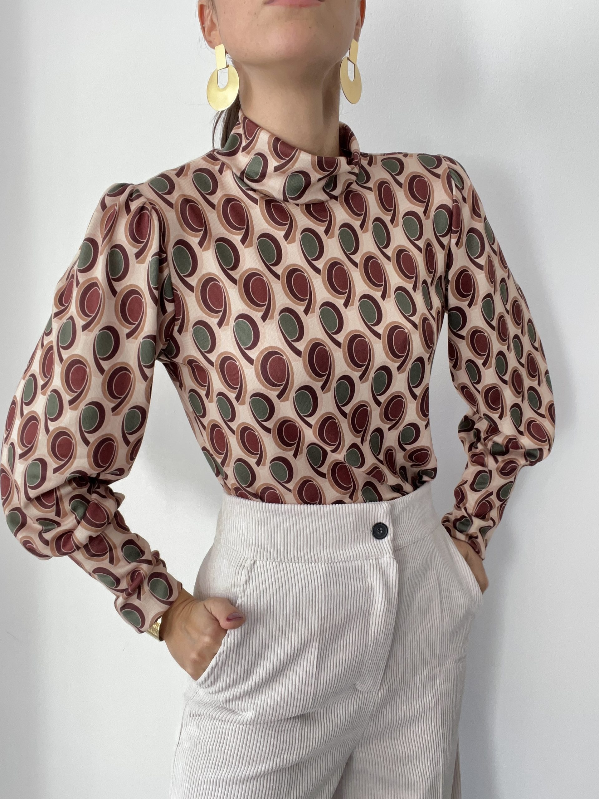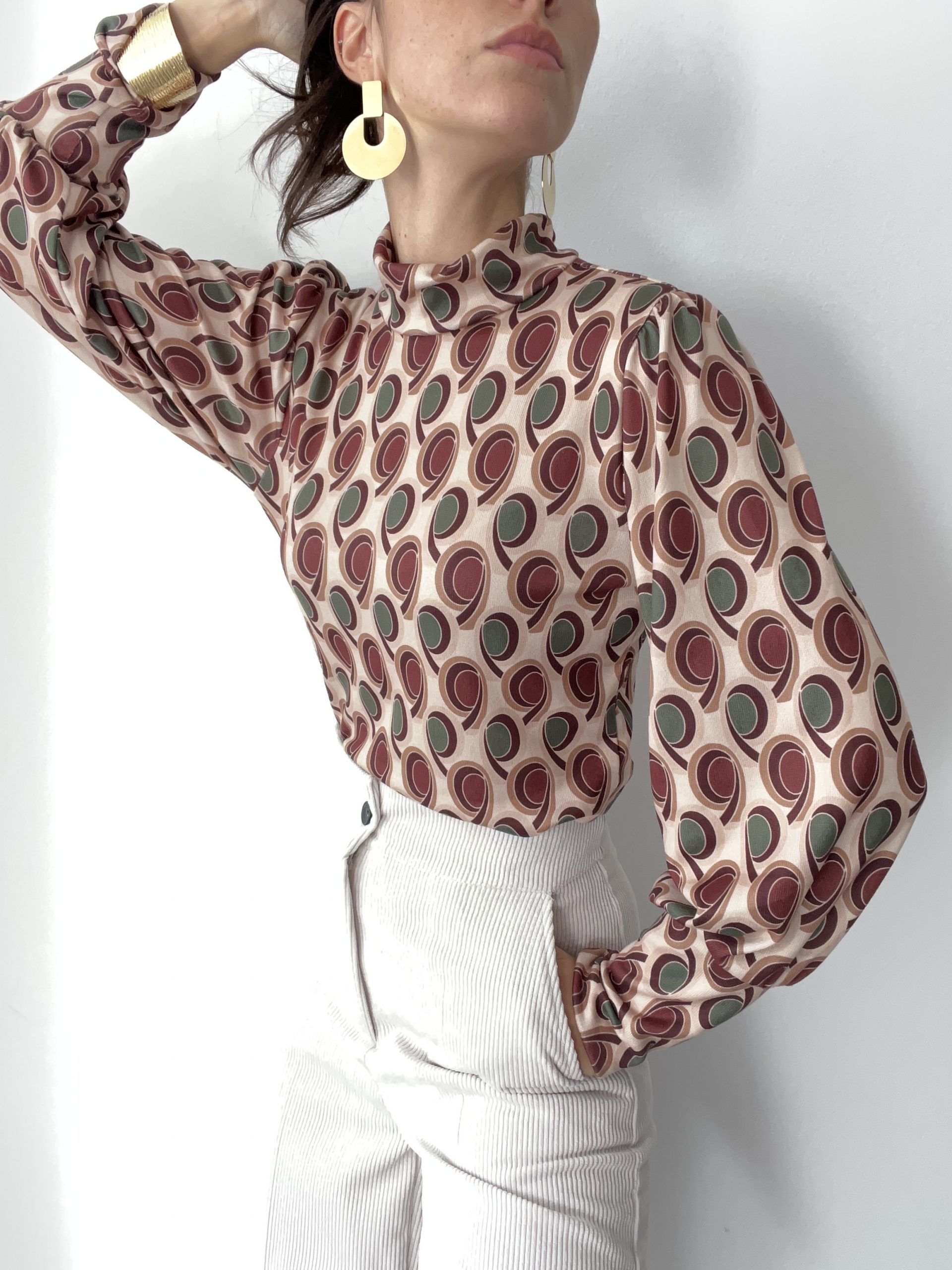 Maglia Made in Italy elasticizzata con stampa. Dettaglio di mezzo collo e polsino elasticizzato.