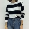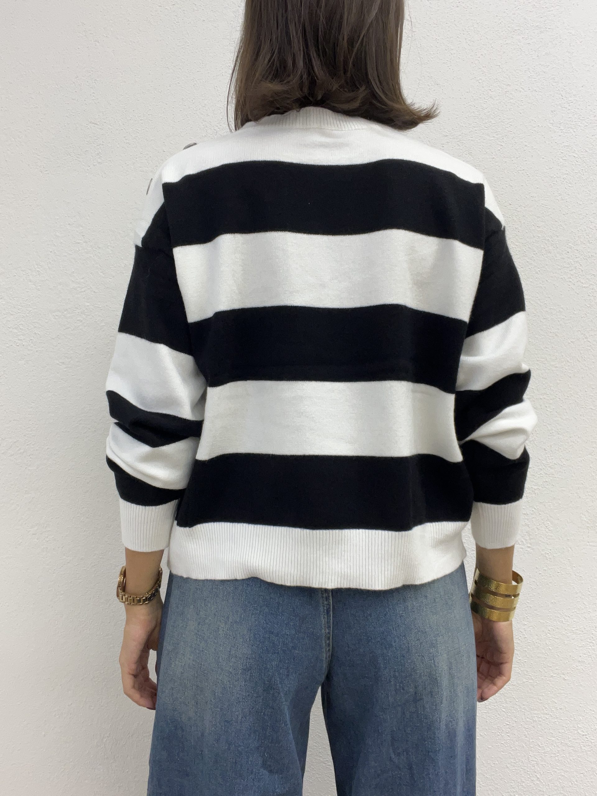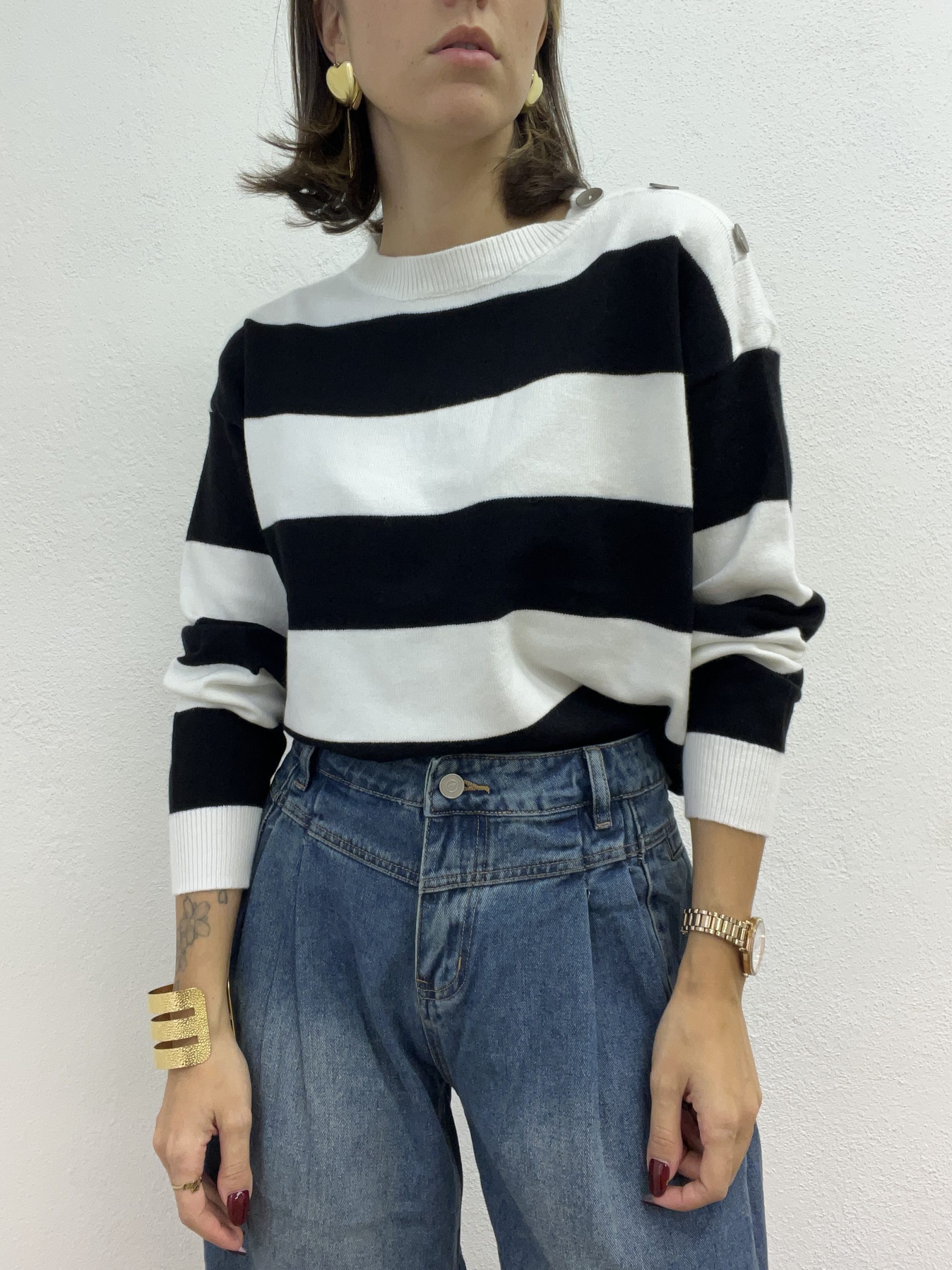 Maglia a girocollo a righe elasticizzato con dettaglio di tre bottoncini sulla spalle.