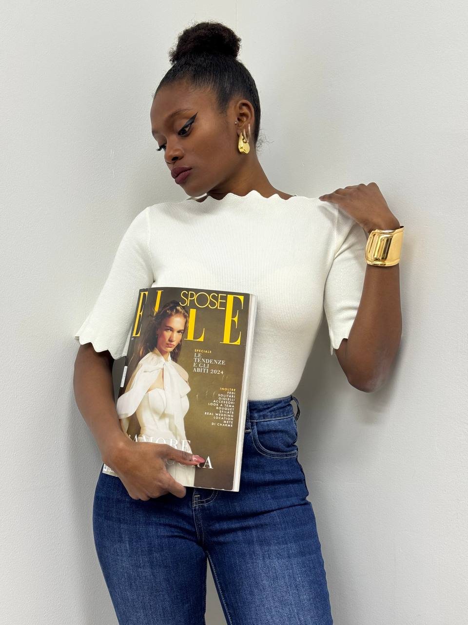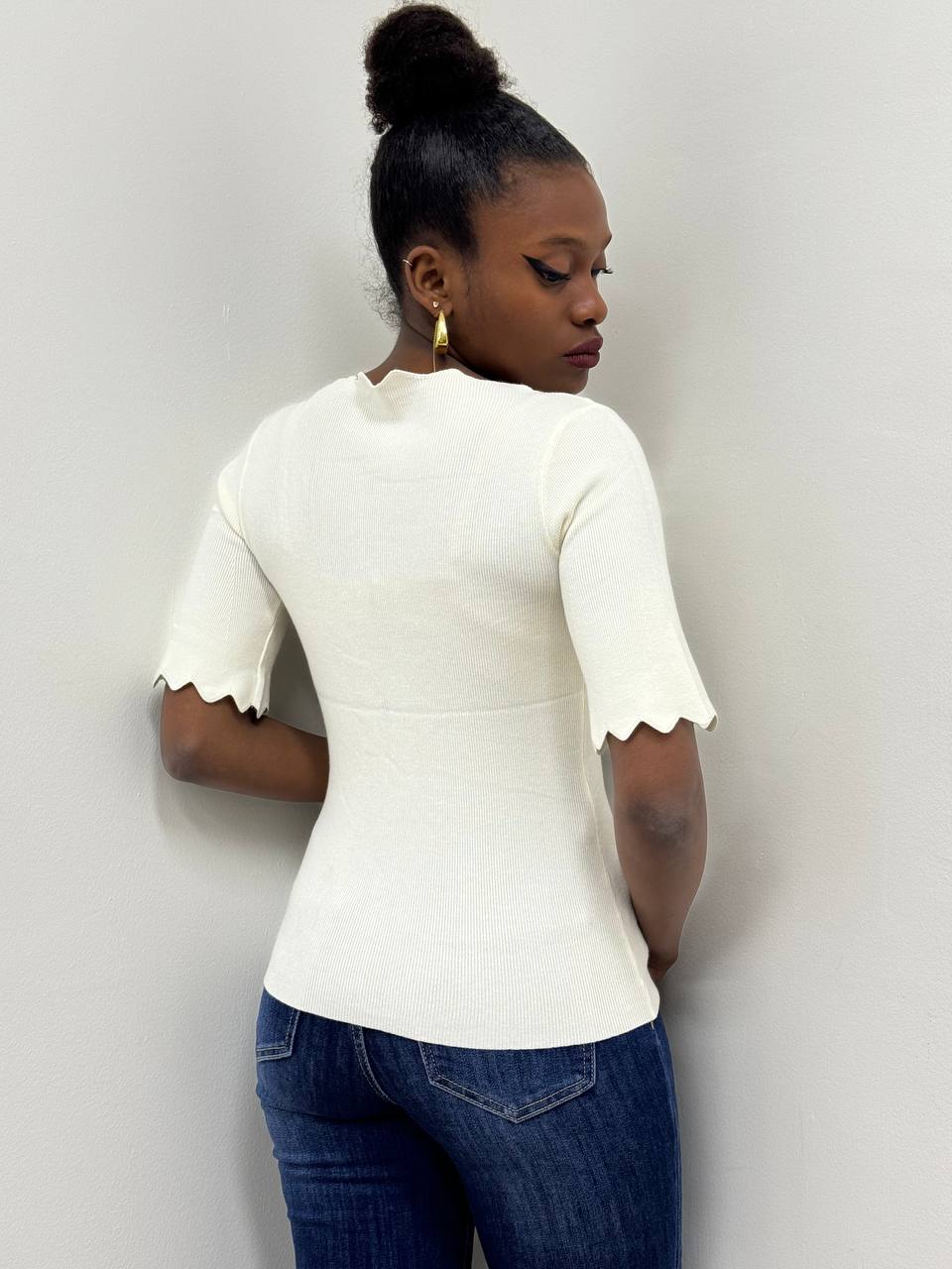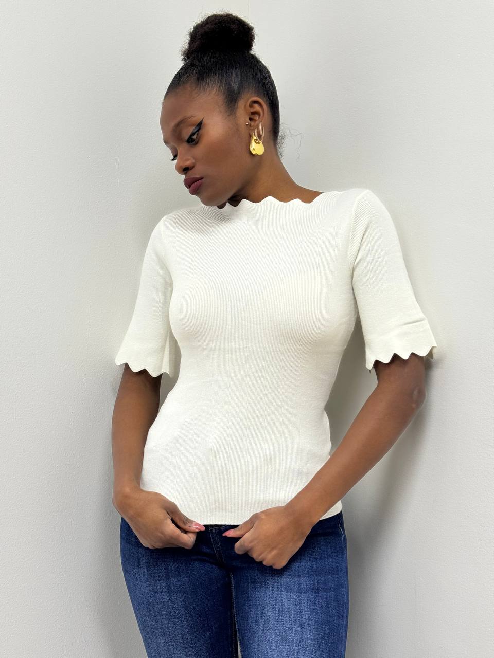 Maglia in viscosa a manica corta elasticizzata con orlo ondulato e tessuto molto elasticizzato.