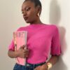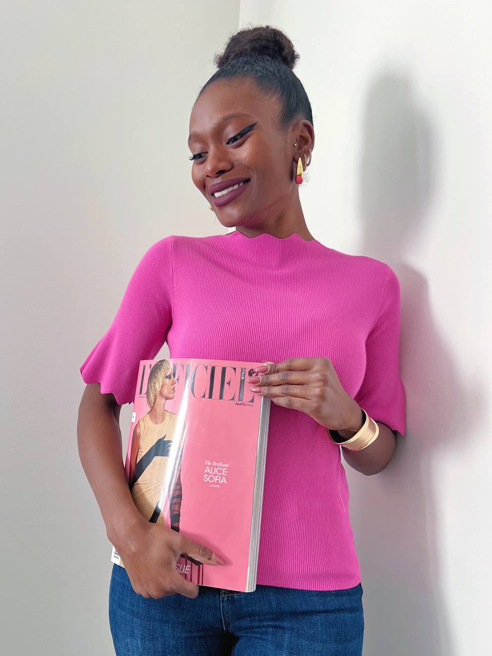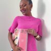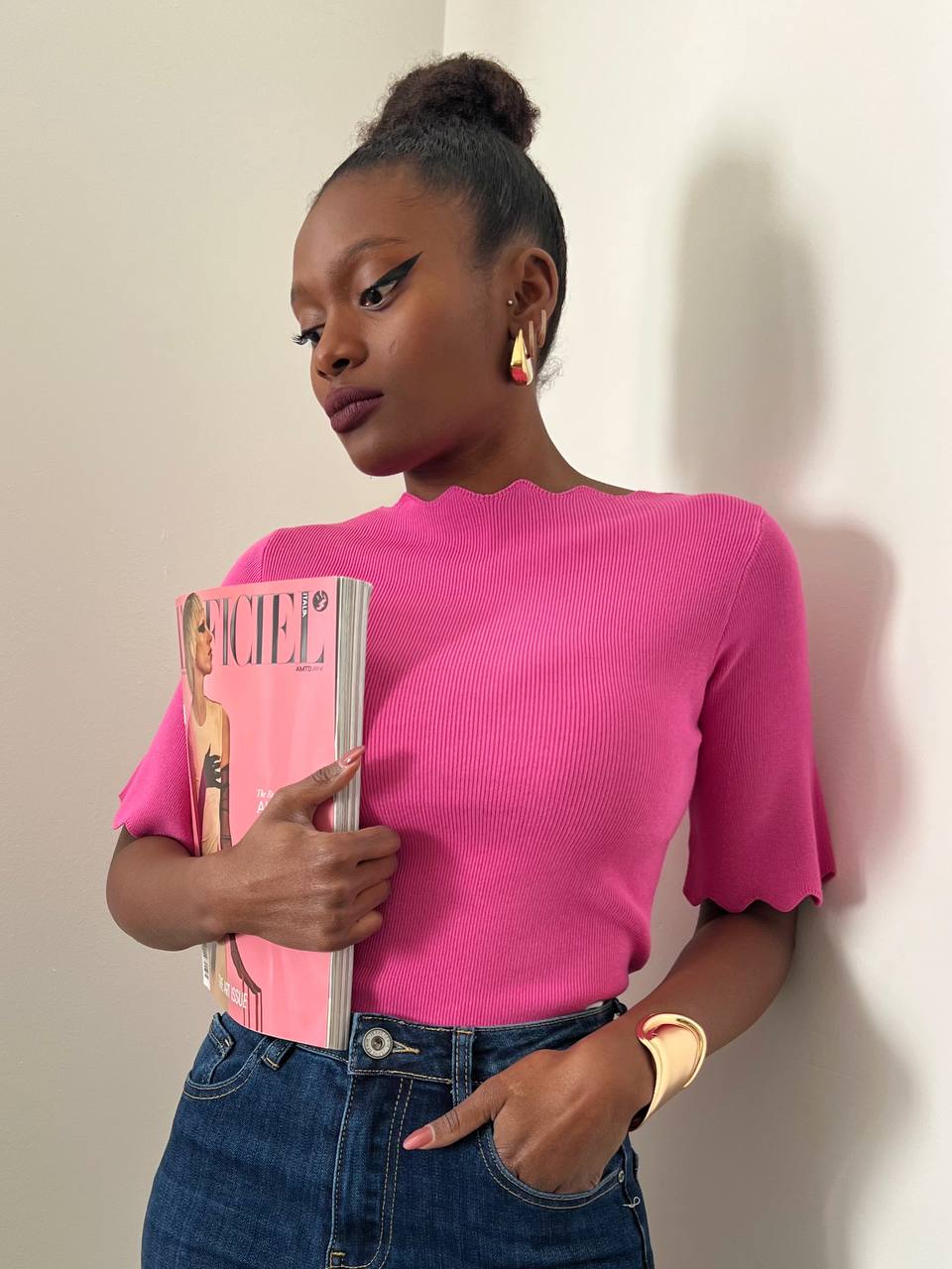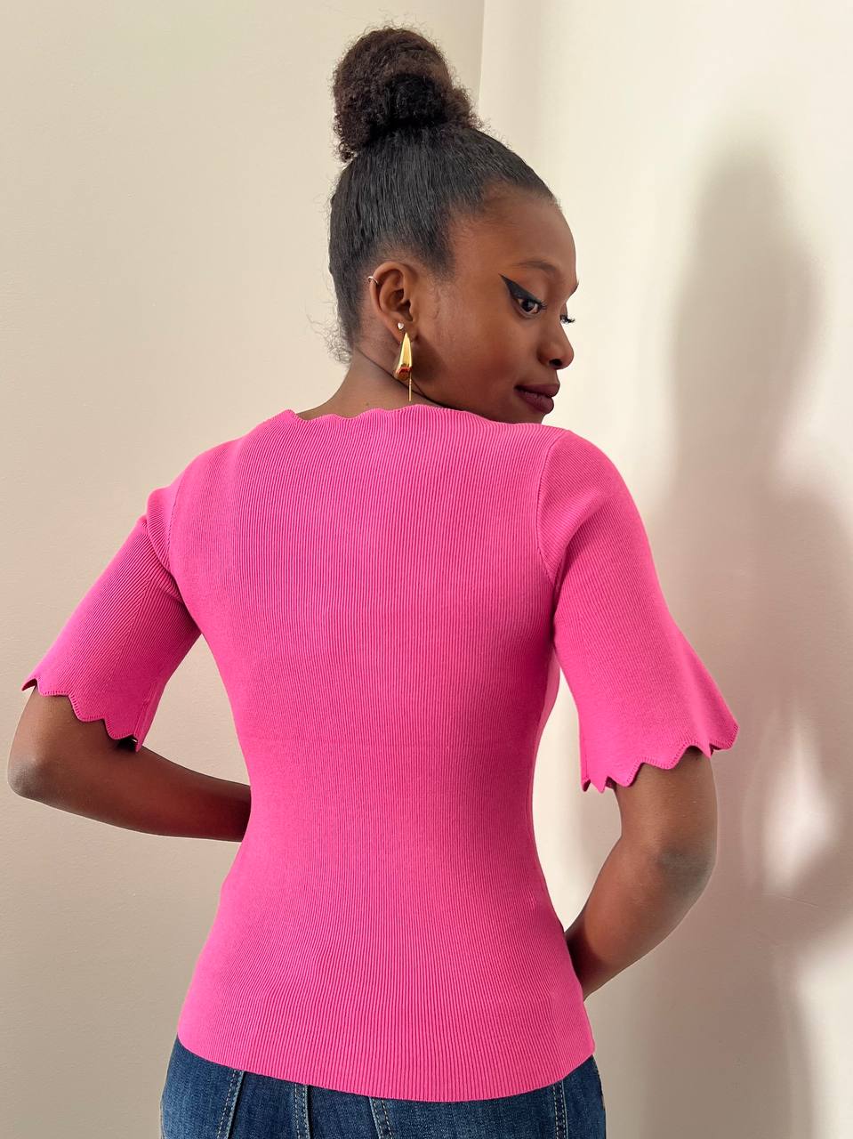 Il design è impreziosito da un delicato orlo ondulato, che aggiunge un tocco raffinato e dinamico al capo, donando movimento e carattere. Le maniche corte elasticizzate completano il modello, assicurando praticità e una linea armoniosa.