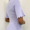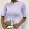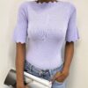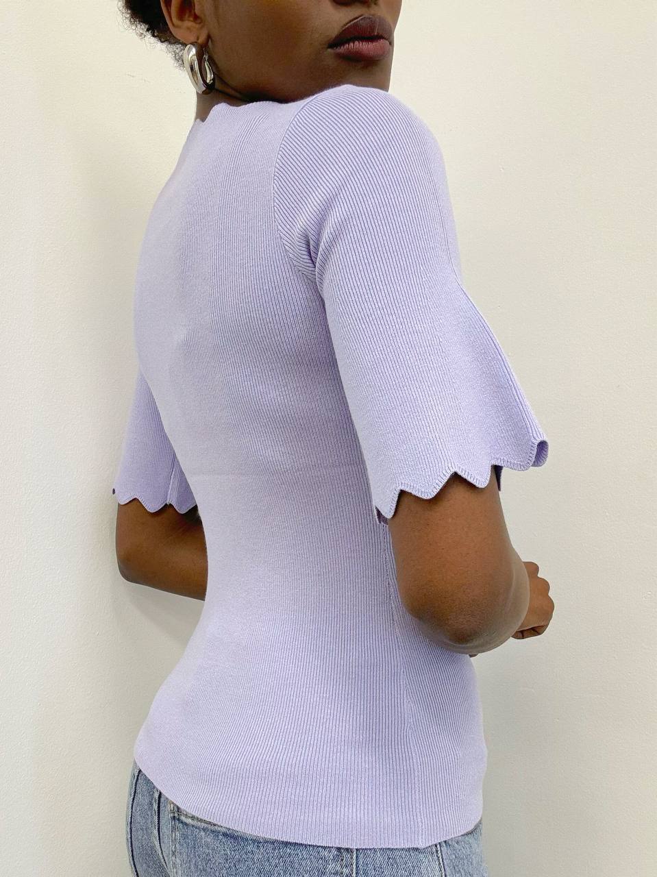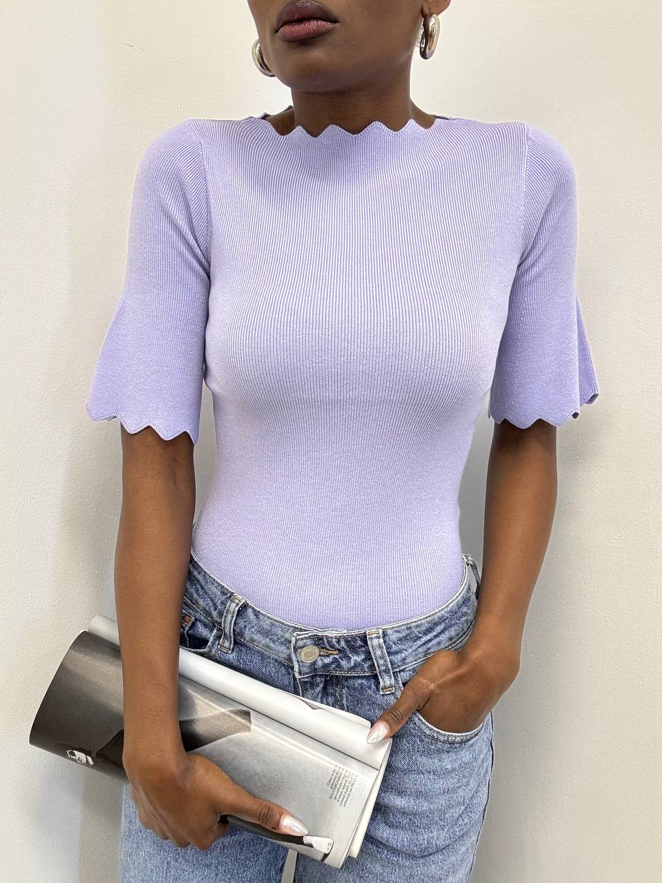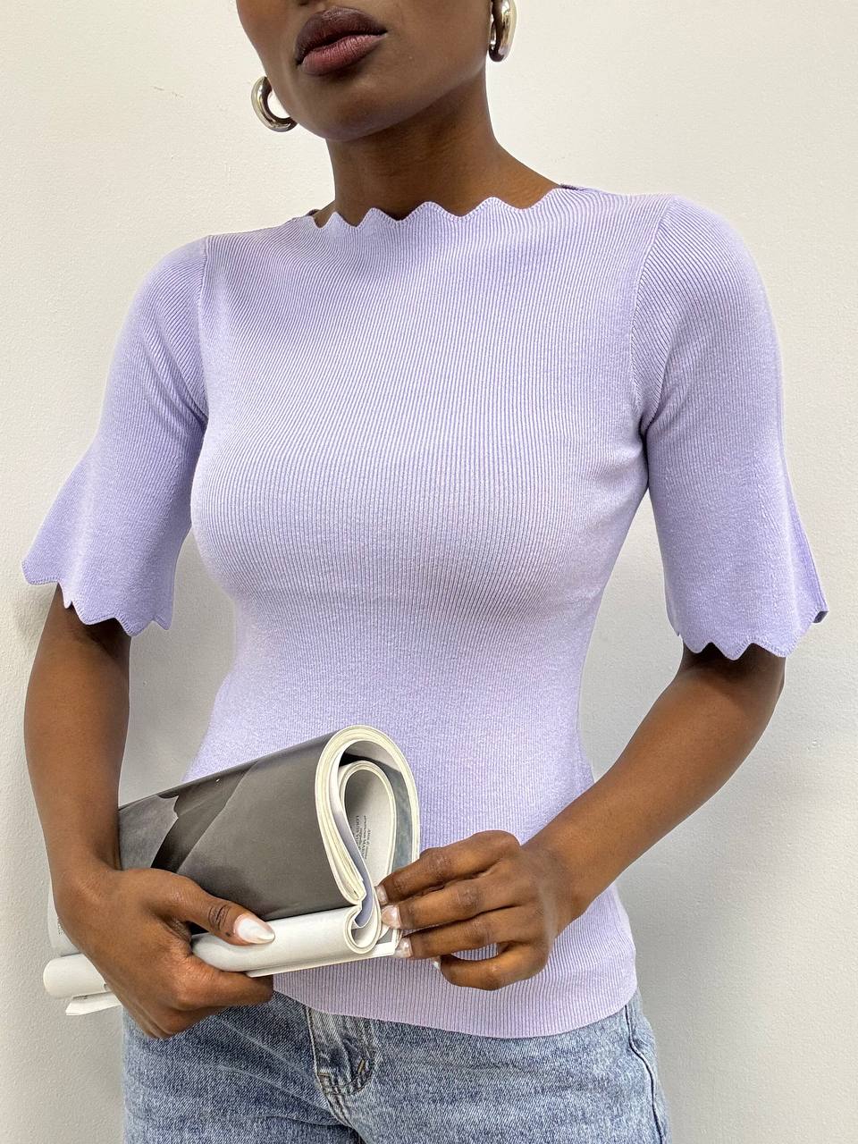 Il design è impreziosito da un delicato orlo ondulato, che aggiunge un tocco raffinato e dinamico al capo, donando movimento e carattere. Le maniche corte elasticizzate completano il modello, assicurando praticità e una linea armoniosa.