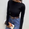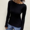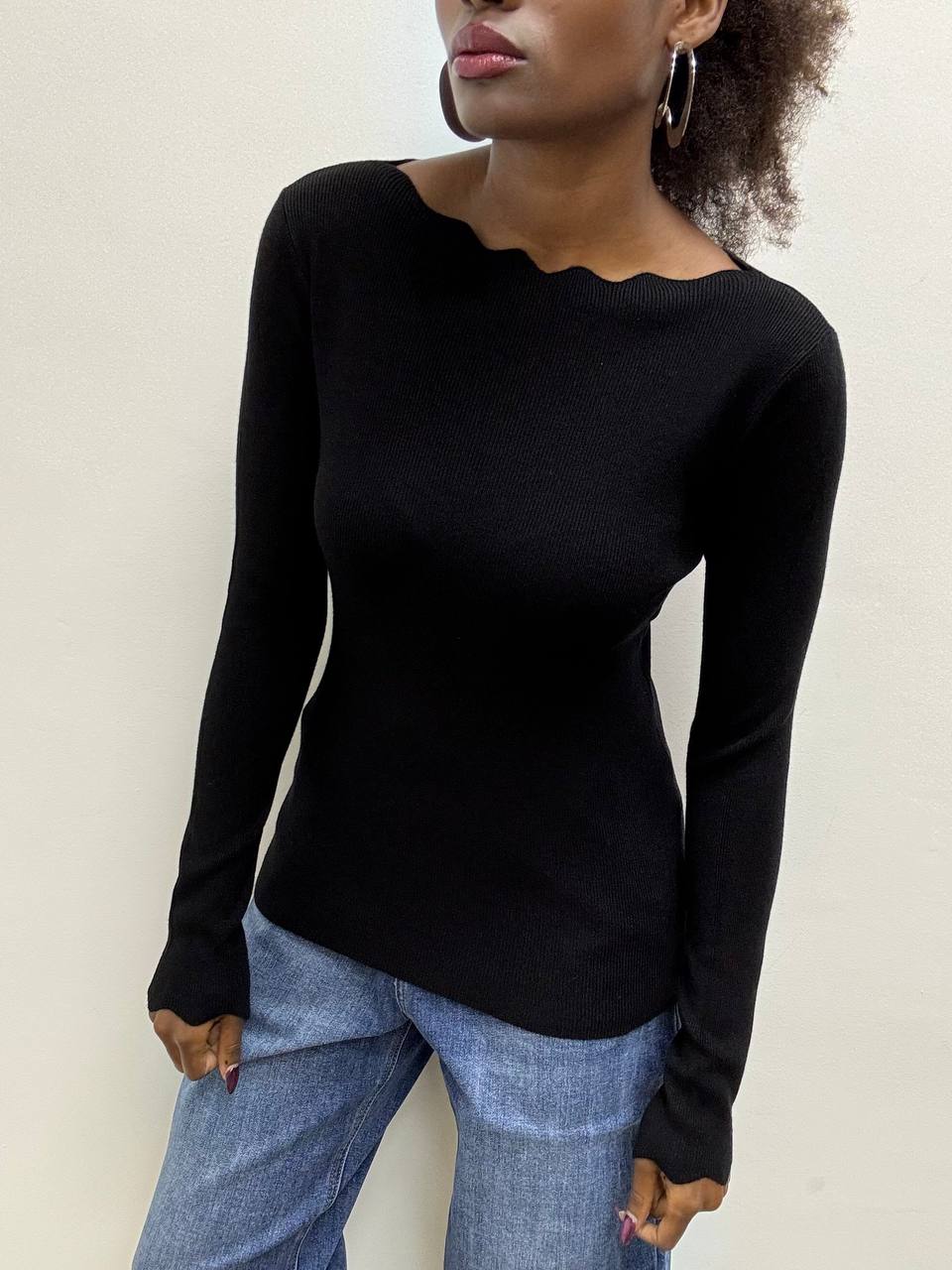 Maglia a manica lunga in morbida viscosa ultra elasticizzata, pensata per seguire delicatamente le linee del corpo senza costrizioni. Il design è arricchito da un raffinato orlo ondulato sul collo e sui polsini, che aggiunge un tocco femminile e ricercato. Perfetta da indossare da sola o come base per look a strati, questa maglia unisce comfort e stile in un capo essenziale ma mai banale.