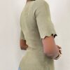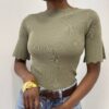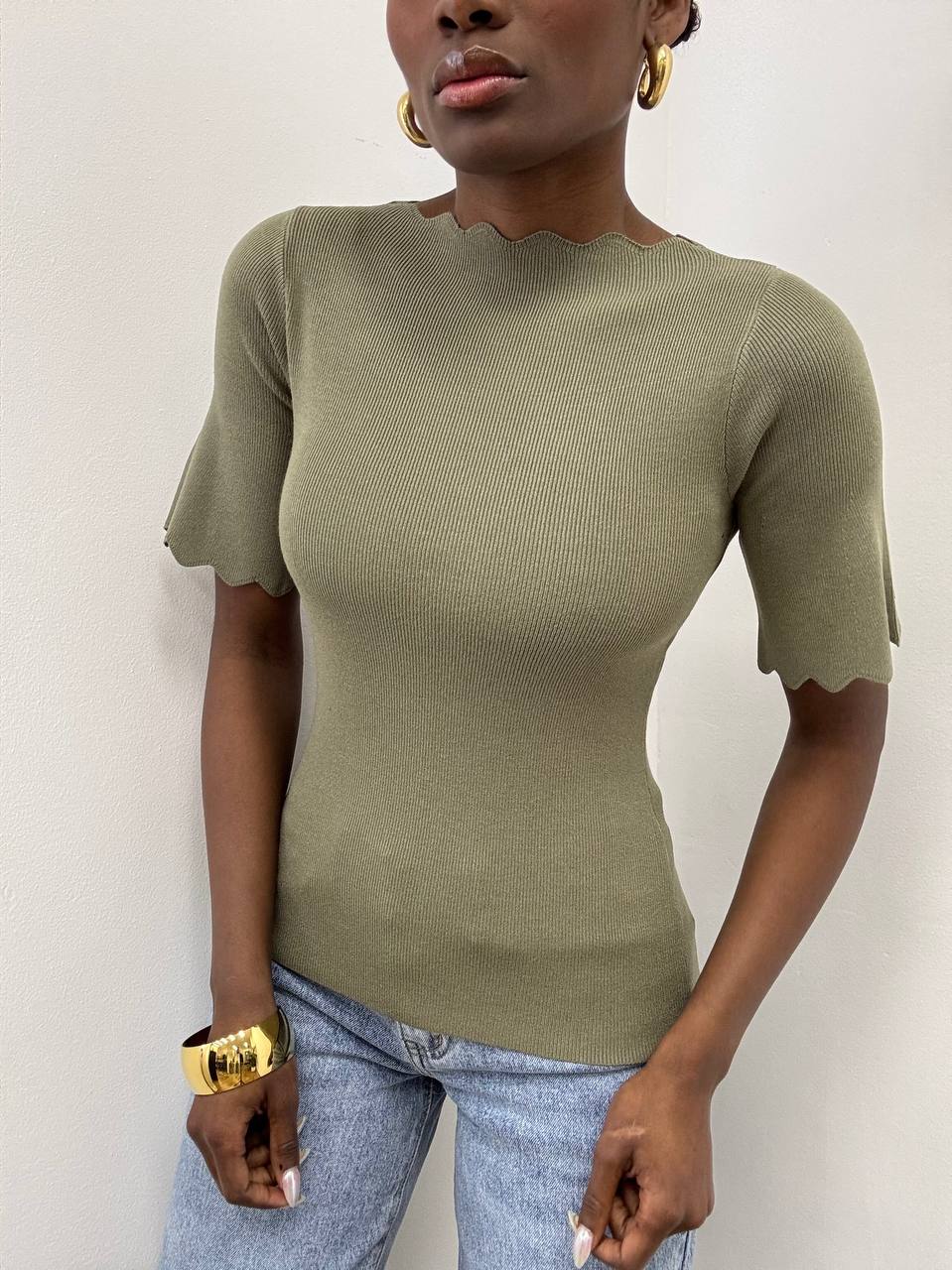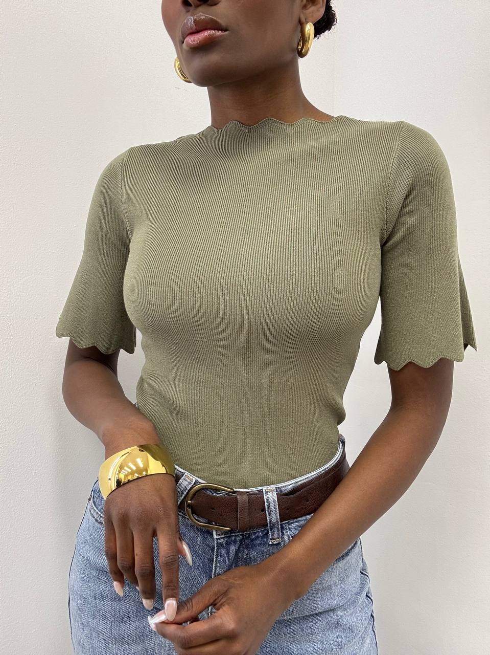 Il design è impreziosito da un delicato orlo ondulato, che aggiunge un tocco raffinato e dinamico al capo, donando movimento e carattere. Le maniche corte elasticizzate completano il modello, assicurando praticità e una linea armoniosa.
