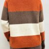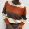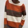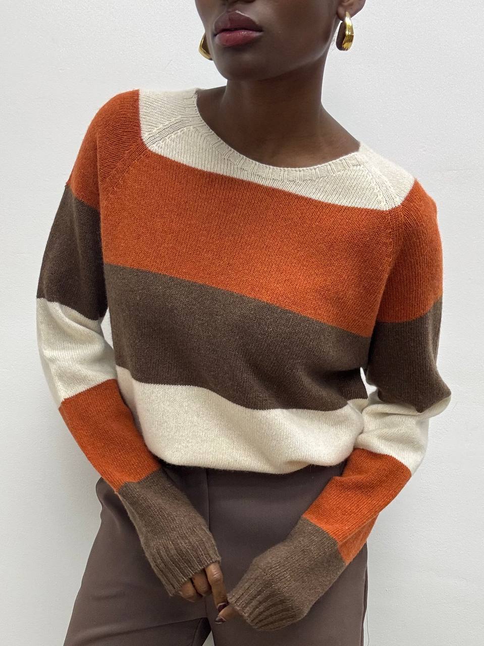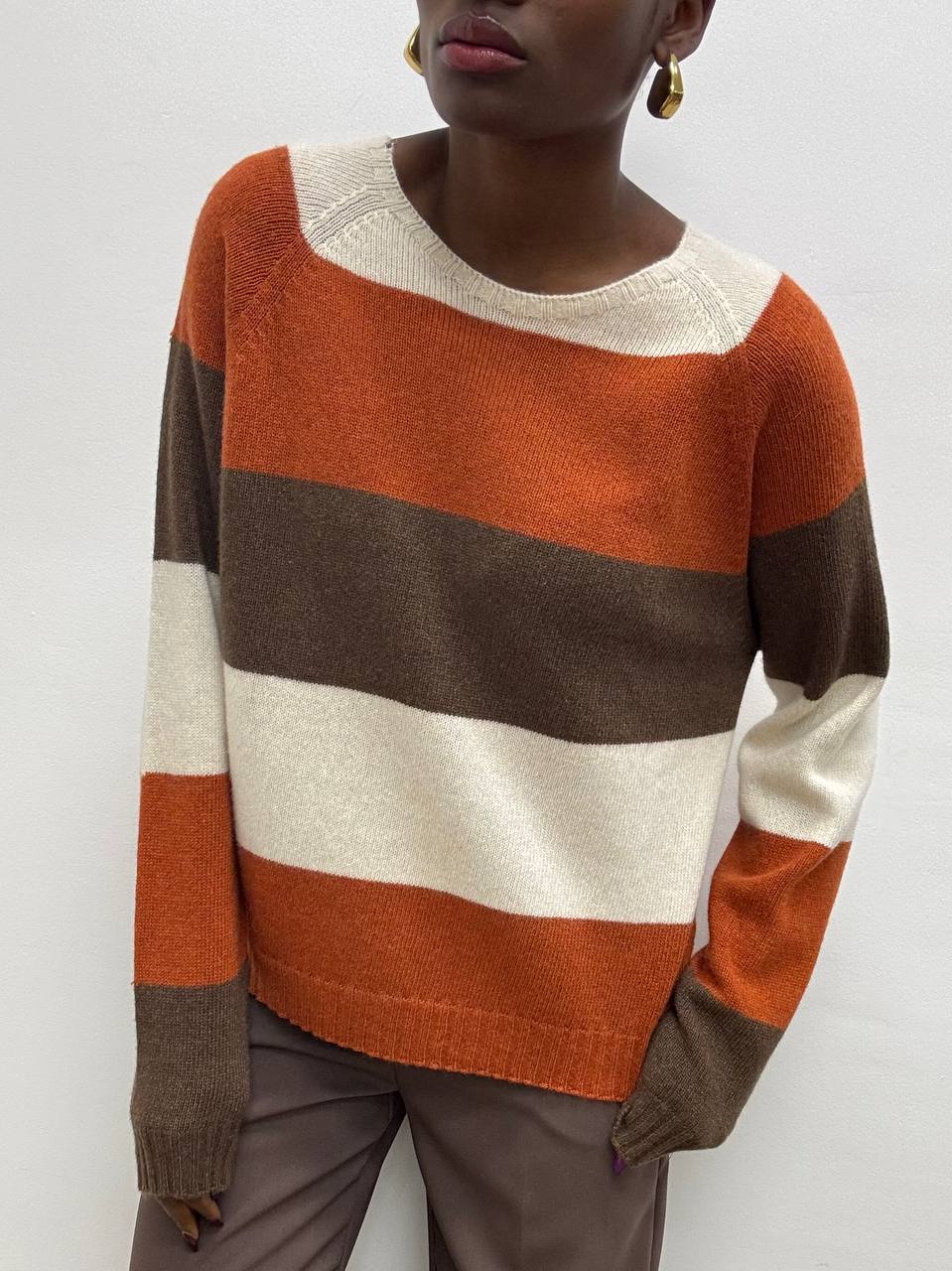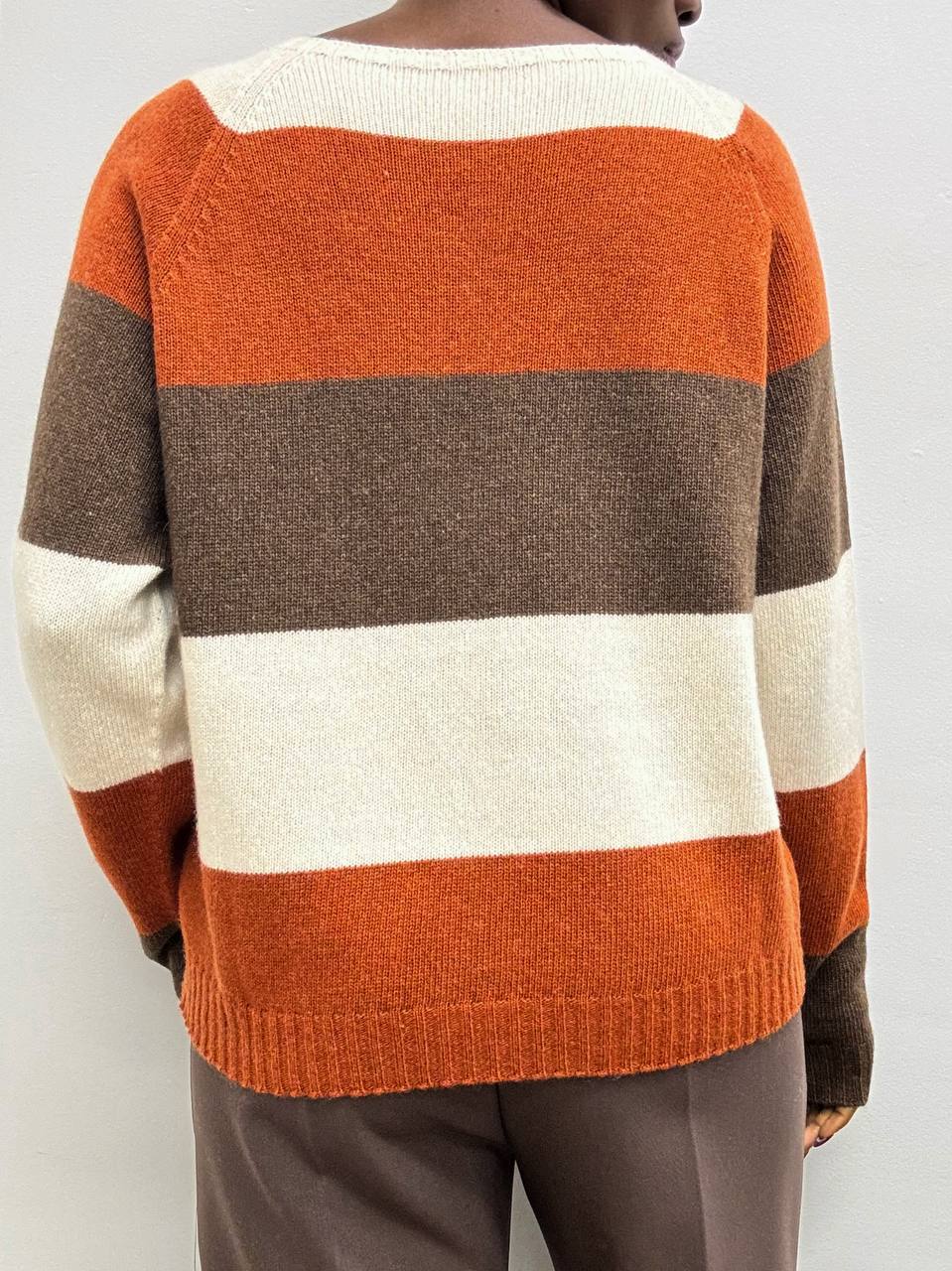 Maglioncino con scollo a barchetta realizzato in un pregiato filato misto lana e misto cashmere, pensato per offrire calore, morbidezza e comfort in ogni occasione. Il design presenta tre maxi righe orizzontali nei toni caldi e naturali del panna, arancione e cioccolato, per un look moderno ma senza tempo.