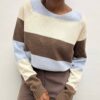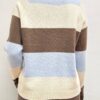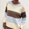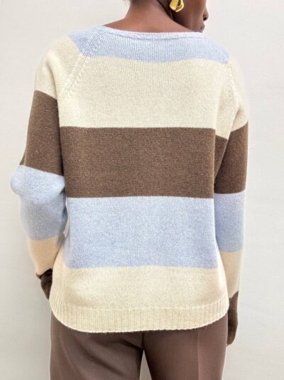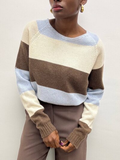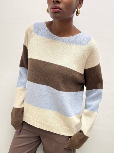 Maglioncino con scollo a barchetta realizzato in un pregiato filato misto lana e misto cashmere, pensato per offrire calore, morbidezza e comfort in ogni occasione. Il design presenta tre maxi righe orizzontali nei toni caldi e naturali del azzurro e panna e cioccolato, per un look moderno ma senza tempo.